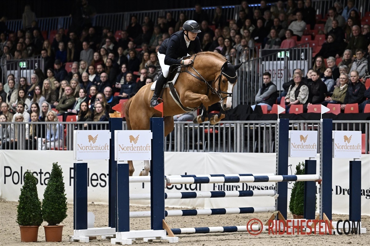 Det var da heller ingen overraskelse, at sejren gik til den altid hurtige Fiorina Ask, der med Karen Møller Rohde i sadlen har taget enormt mange sejre op gennem unghesteklasserne. Fiorina Ask er en 7-års hoppe efter Dominator 2000 Z/ Carthago, som er opdrættet på Stutteri Ask, og det er altså også med Karen Møller Rohde i sadlen, at hun er blevet suverænt uddannet. Parret red på banen som en af klassens sidste ekvipager, men det holdt dem altså ikke fra at tage sejren i tiden 37,04 sekunder foran de resterende 34 deltagere.