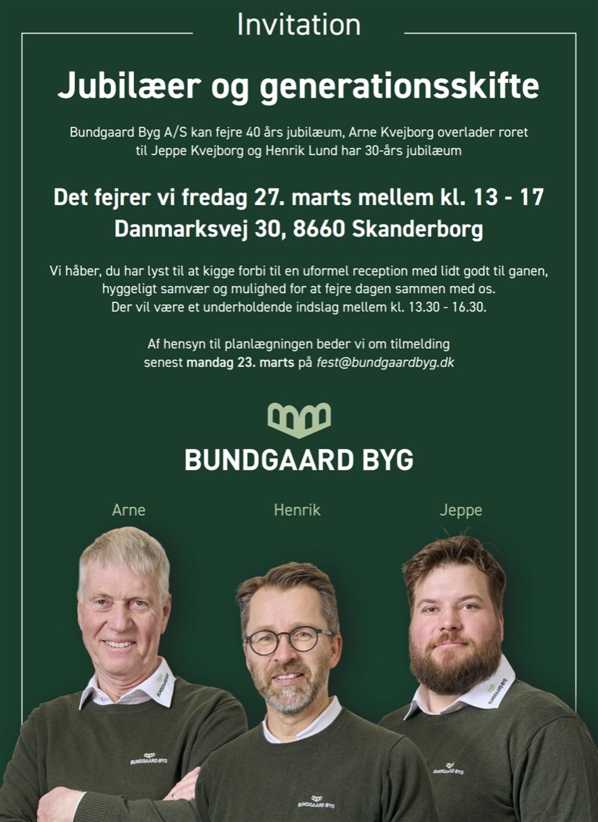 Bundgaard Byg A/S kan fejre 40-års jubilæum, Arne Kvejborg overlader roret til Jeppe Kvejborg og Henrik Lund har 30-års jubilæum i virksomheden.