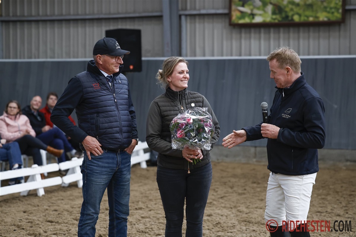 Stine Klausholt viste den nykårede præmiehingst Cash Back e. Cador/ Casino Grande frem. Det er en hingst, Ib har indkøbt fra samarbejdspartneren Hof Sosath, og derfor fik den tidligere ejer Gerd Sosath lov til at sige et par ord om den imponerende unge hingst.