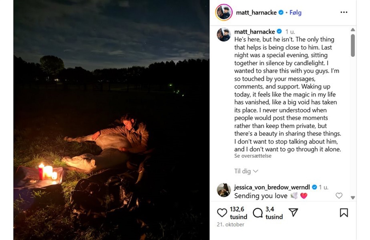 I en følelsesladet filmoptagelse fortæller Matt Harnacke om sin hest Emporio, som han købte som 3-årig hingst, og som har haft stor betydning i hans og partneren Jesse Drents liv de seneste syv år. Matts følgere på Instagram har kunnet følge den prægtige hingst i en årrække.