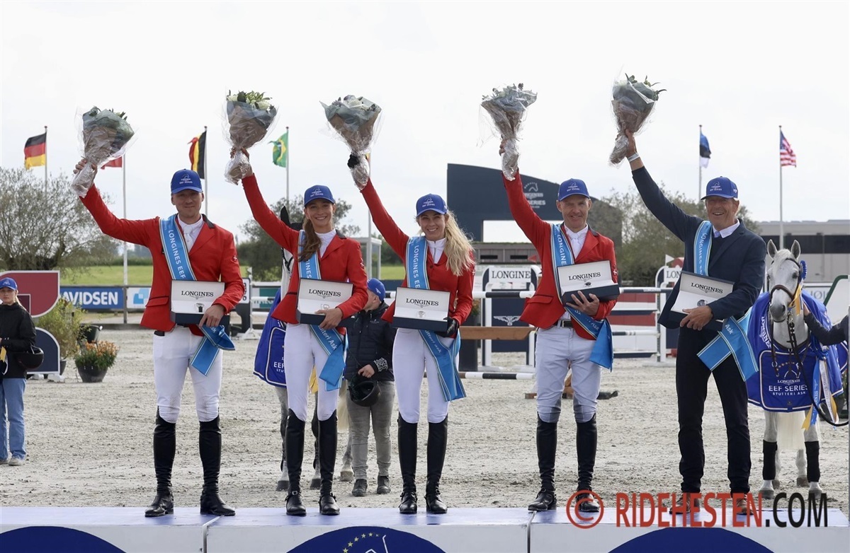 Nogle af bruttogrupperne for springrytterne er blevet opdateret. Her ses nogle af seniorerne fra EEF Longines Nations Cup på hjemmebane. Fv. Andreas Schou, Caroline Rehoff Pedersen, Zascha Nygaard, Søren Møller Rohde og landstræner Bo K. Møller. Foto: Ridehesten.com/ Aviaja Vindum Hansen