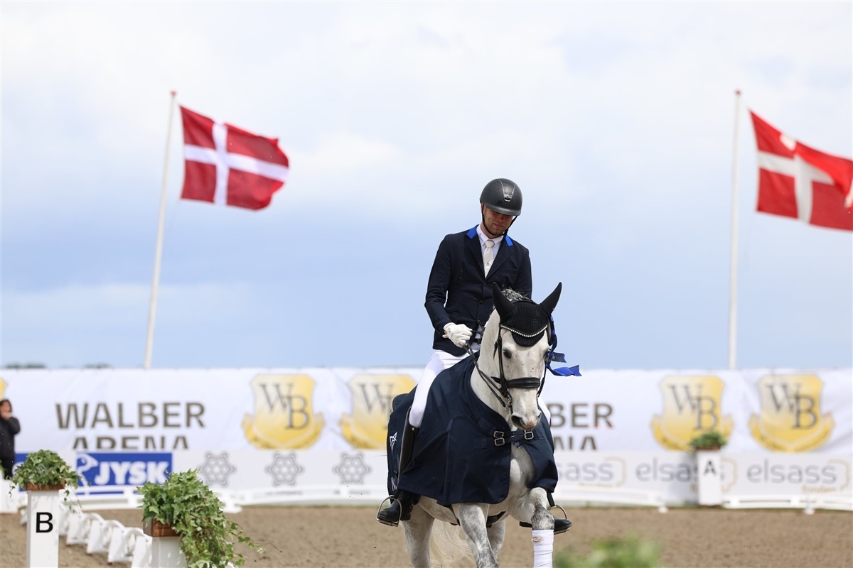 Det ser dog ikke ud til, at Tobias har hvilet på laurbærrene imens han har holdt stævnepause, for han tog sig både af første- og andenpladsen i dagens klasse. Førstepladsen sikrede han sig på sin mangeårige makker, DV-hoppen Jolene Hill e. Blue Hors Schufro Hit/ Windsor (opdr. Hanne Andreasen). Parret var medaljefavorit til PL i Paris i sommers, men da hoppen desværre blev ramt af transportsyge, måtte de trække sig fra konkurrencen. I dag vendte de så tilbage med stil, da de red til 76,814% og dermed sikrede sig en suveræn sejr.