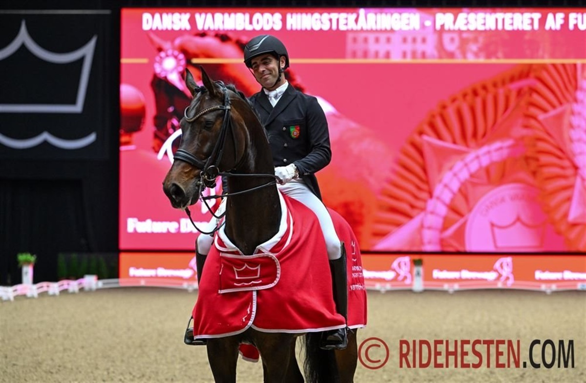 – Her blev han i 2016 godkendt i Dansk Varmblod og udnævnt til præmiehingst, og han blev i efteråret en særdeles overbevisende vinder af 35-dages materialeprøven med intet mindre end syv 10-taller og et resultat på fremragende 977,5 point. Efterfølgende præsterer han det ene flotte resultat efter det andet, og listen af meritter og titler vokser støt i en nærmest ubrudt række de næste mange år af hans særdeles flotte unghestekarriere, fortsatte talsperson for avlsledelsen i dressur, Vicky Nortvig, i sin præsentation af Årets Hingst, som blev fremvist af den portugisiske rytter Roberto Brasil inde i Jyske Bank Boxen lørdag eftermiddag.