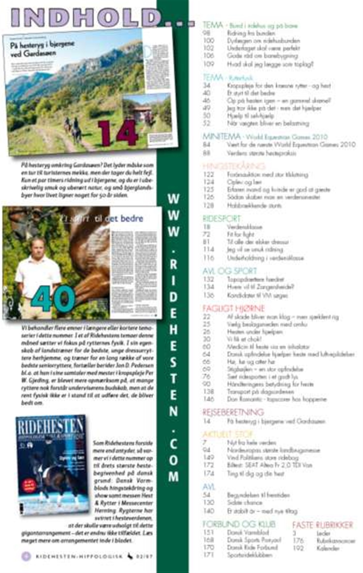 Netop nu er Ridehestens februarnummer udkommet. Magasinet er nu på hele 196 sider fyldt med spændende læsning om alt hvad der rører sig i hesteverdenen. I det nye nummer kan du blandt meget andet læse den gribende artikel om Tanja Aulbjerg fra Silkeborgegnen, som har fået store problemer med sin hoppe efter et skoningsarbejde af værste skuffe, foretaget af en "ikke registreret" beslagsmed. Sagen har nu udviklet sig til en dyreværnssag. I det nye nummer finder du også et stort tema om rytterfysik. Her kan du blandt andet læse om, hvordan du plejer og passer din krop korrekt, så din ridning bliver endnu bedre. Som altid er Ridehesten fyldt med dugfriske stævnerepotager og nyheder fra ind- og udland.