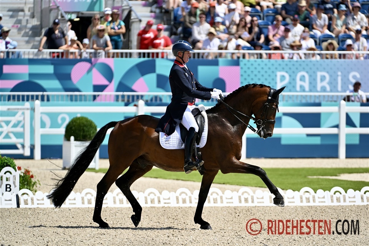 Storbritanniens sidste ekvipage, 58-årige Carl Hester og den 15-årige hingst Fame e. Bordeaux 28/ Rhodium har netop været på banen. Den erfarne ekvipage har blandt andet deltaget ved OL i Paris i 2024, hvor de var på det bronzevindende hold. I dag red de på banen som femte sidste rytter, og var altså Storbritanniens sidste håb for en guldmedalje.