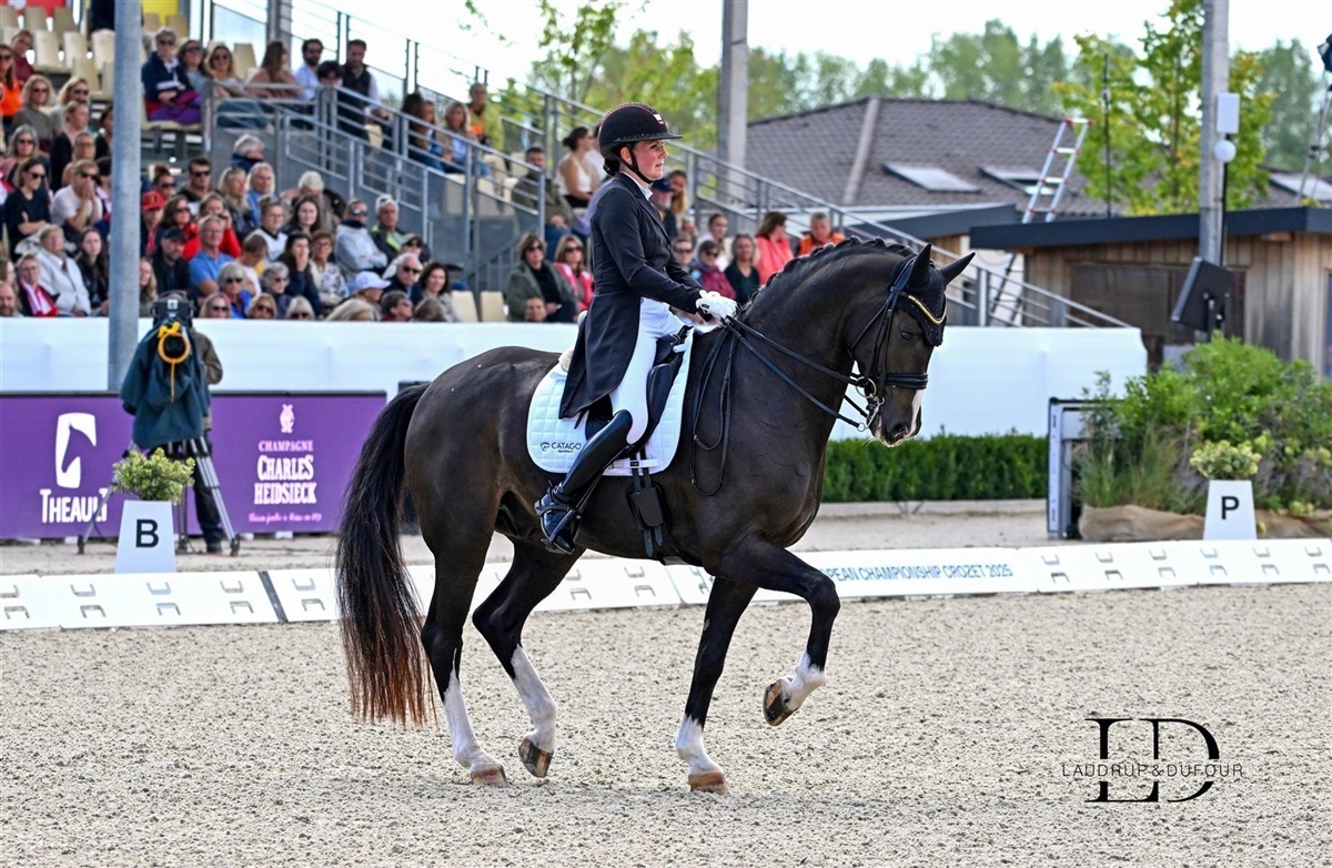 Anden danske ekvipage på banen i dag var 32-årige Nadja Aaboe Sloth og Favour Gersdorf e. Foundation/ Leandro (opdr. Inger-Marie Andreasen), der kom på banen som fjerde ekvipage i klassen. Nadja og den 12-årige DV-vallak var medrejsende reserve ved OL i Paris 2024 og har efterhånden en del erfaring og gode resultater på den internationale scene, men EM er deres første store, internationale mesterskabsstævne som repræsentant for Danmark. Nadja Aaboe er stille og roligt avanceret op igennem bruttogruppe-systemet fra perspektiv til A-gruppen siden 2022.