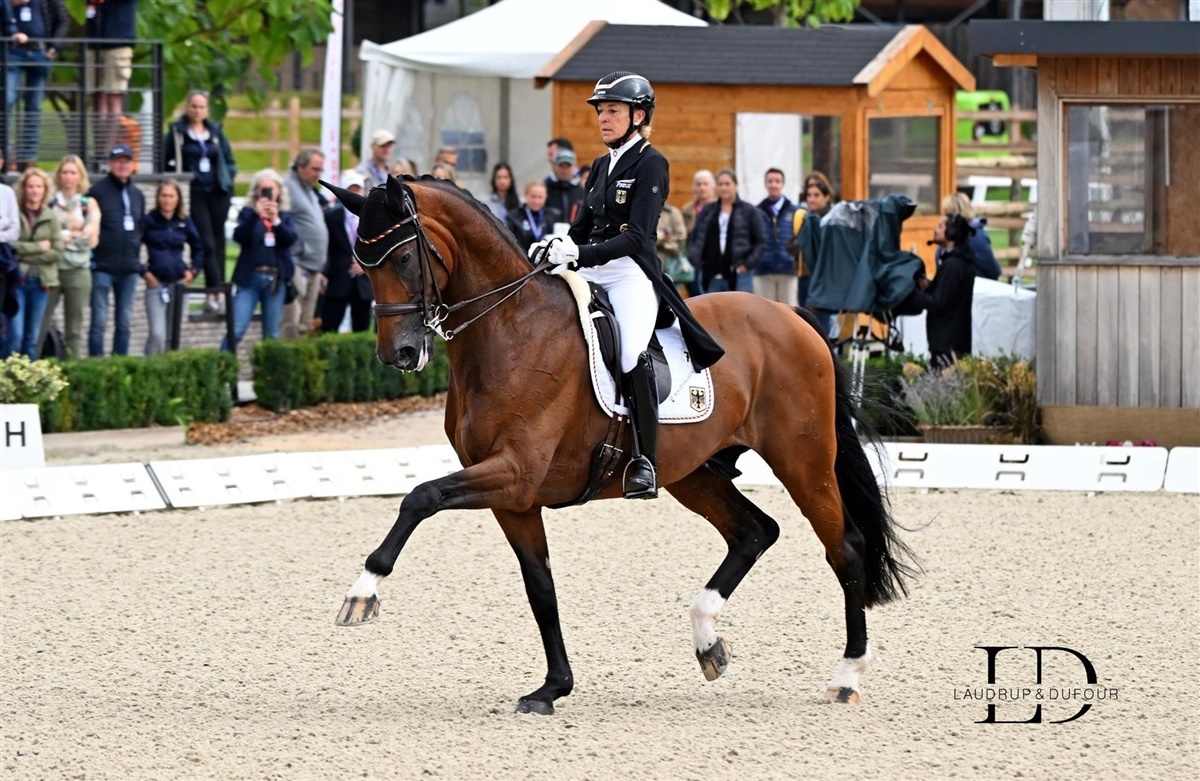 Første danske ekvipage på banen i dag var 54-årige Rikke Dupont og Grand Galiano e. Grand Galaxy Win/ Blue Hors Don Schufro (opdr. Lotte og Gert Buchhave). Rikke og den 10-årige DV-vallak indfriede ved sommerens CHIO i Aachen for alvor deres potentiale, som er i tråd med den udvikling, der har været, siden de i 2022 blev en del af DRF’s perspektivgruppe. På baggrund af Aachen-resultaterne blev Rikke en del af A-gruppen og for første gang udtaget til at repræsentere Danmark ved et stort, internationalt mesterskabsstævne, hvilket de gjorde rigtig flot i onsdagens Grand Prix.