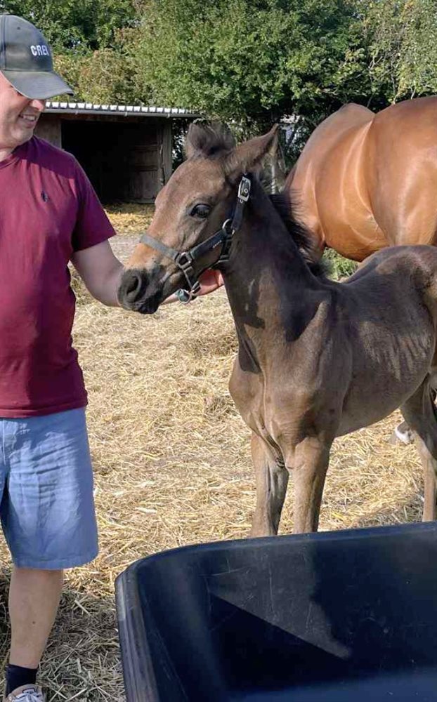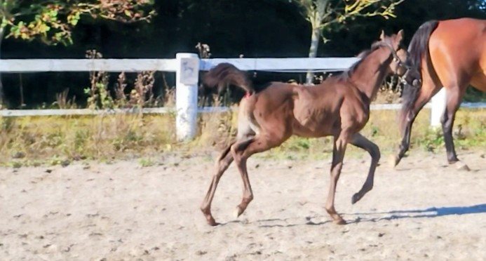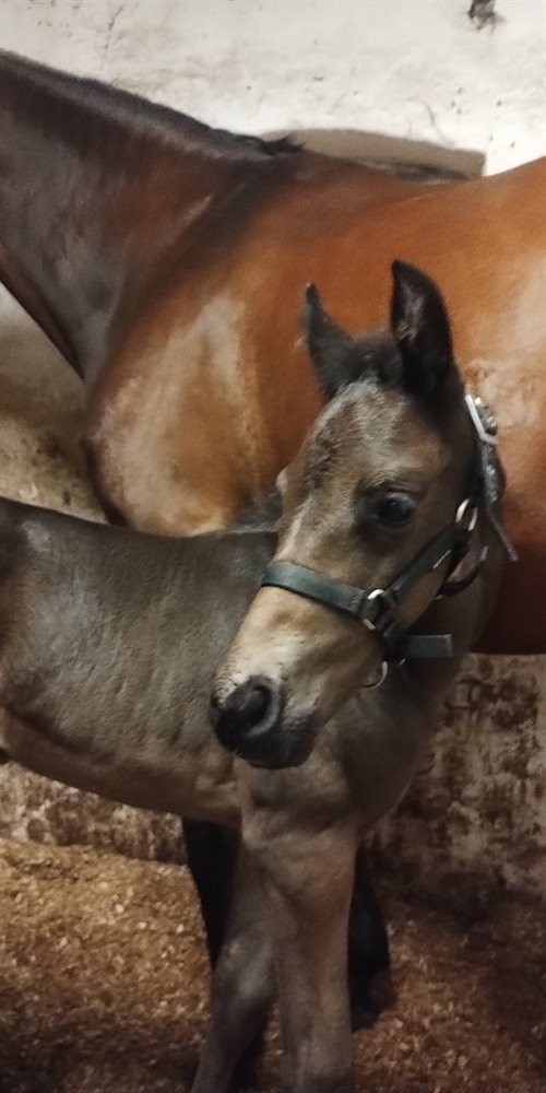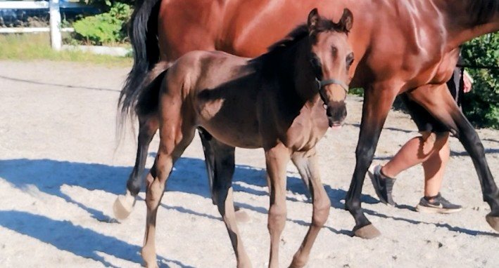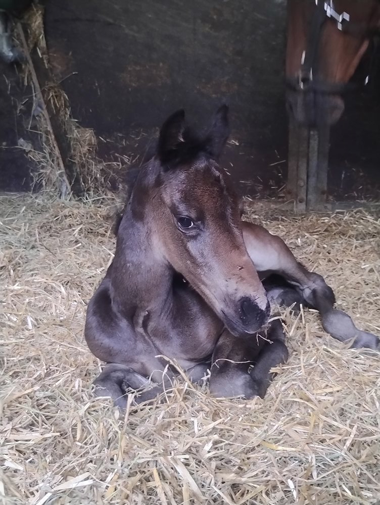 Sortbrun hingsteføl uden aftegn, født juli 2025, efter stærk præstationsstamme med både ridelighed, kapacitet og udstråling i topklasse.