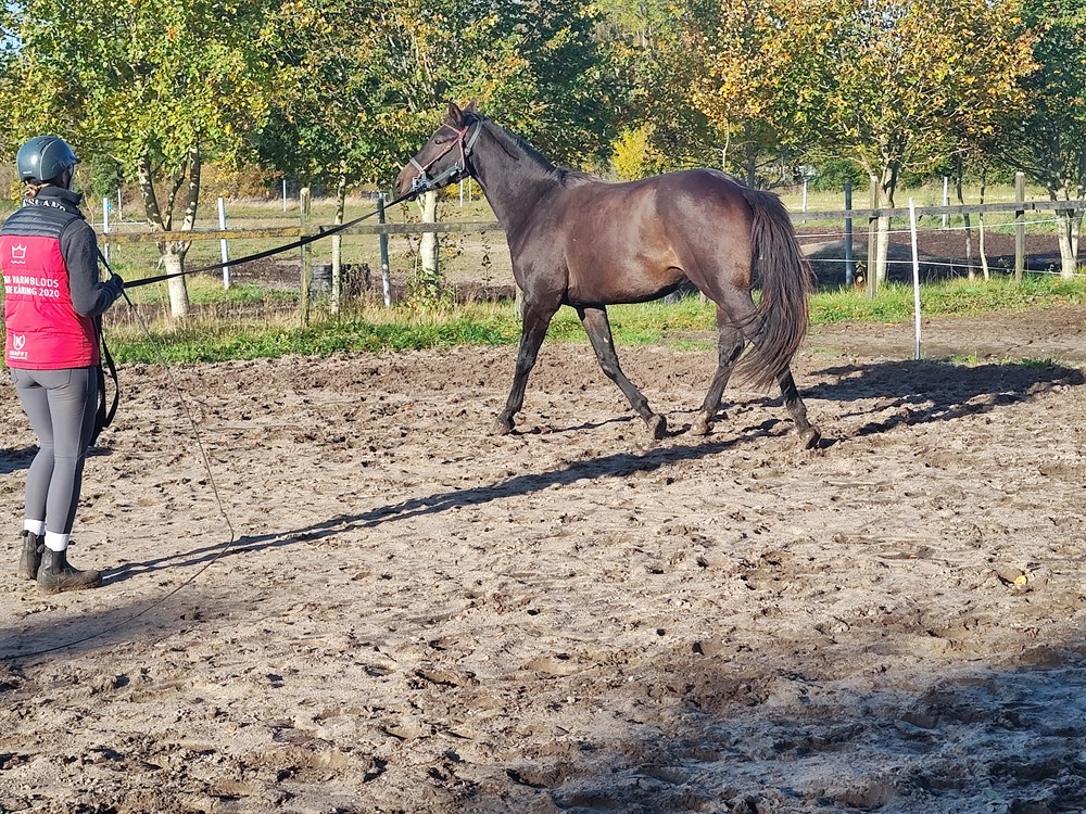 Er opstartet tilridning med trense, gjord og rytter uden sadel. Han er super god til indparkering.