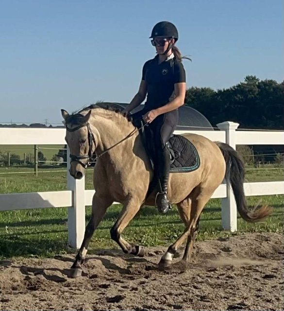 Hun elsker en go skridttur ud i det fri og viser også virkelig go teknik (og lyst) i spring. Helsøster og adskillige halvsøskende er b-ponyer i både dressur og spring, og går på stævnebanerne i både DK og Norge