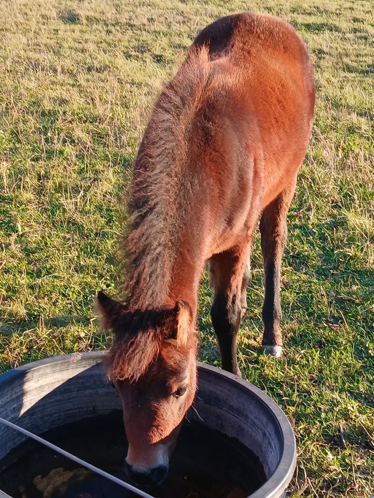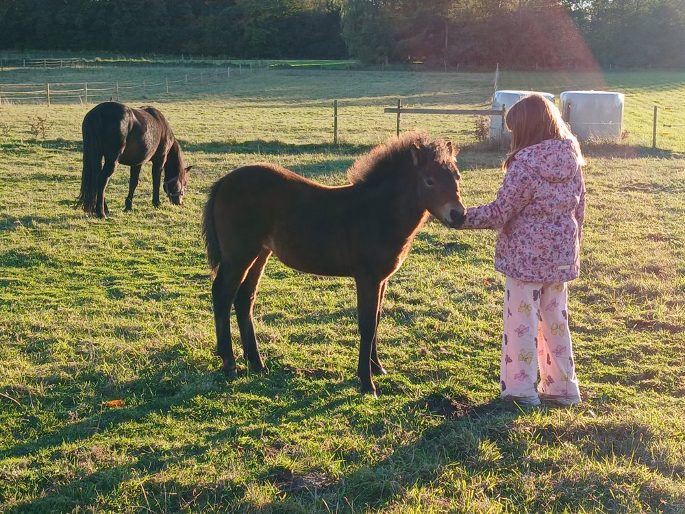 Søde Nova søger sit nye hjem. Nova er et hoppeføl født d. 13.07.25, og er af racen Dartmoor pony med rødt pas. Hun forventes at blive omkring 120 cm i stang.