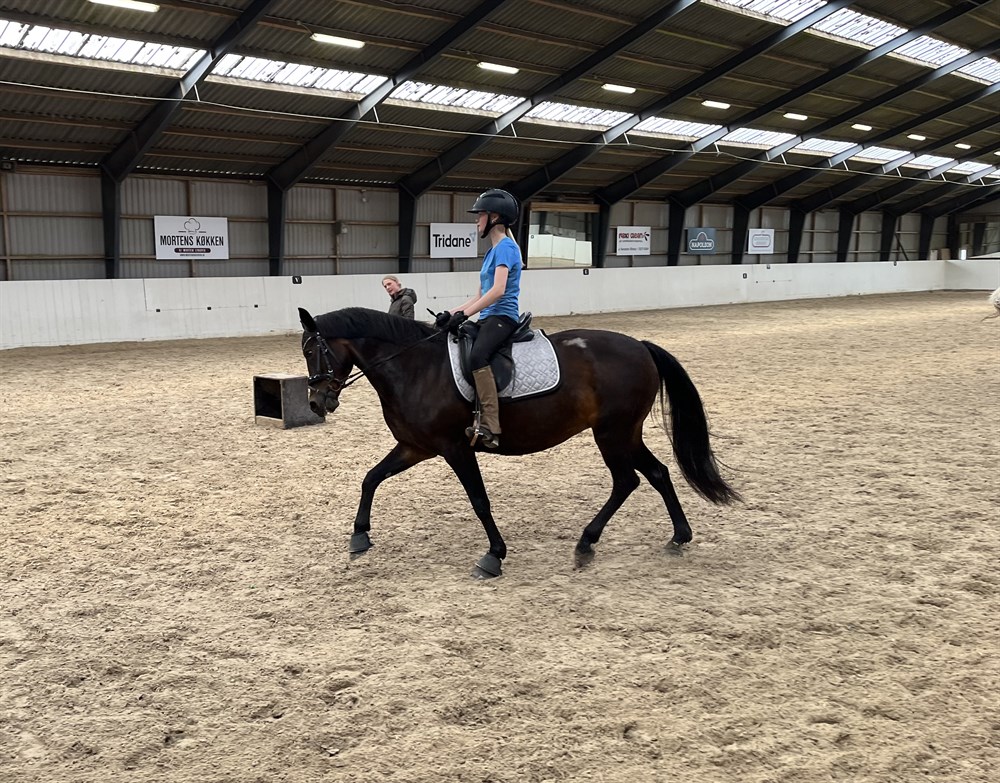 Hun elsker også at komme på tur og at springe og har med tidligere ejer også sprunget på militarybane. Springningen har vi kun brugt som afveksling.