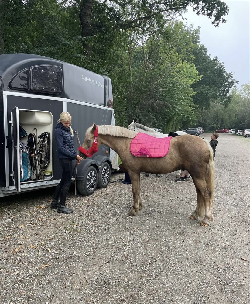 Han kræver lidt træning, hvis han skal gå i trailer alene, men går lige op, hvis der står en anden hest med.