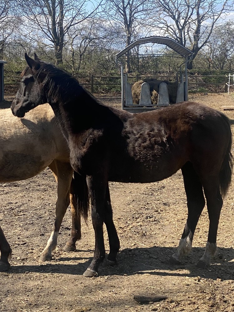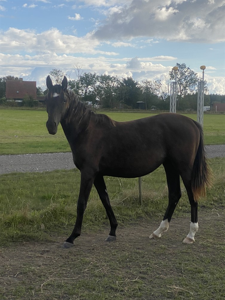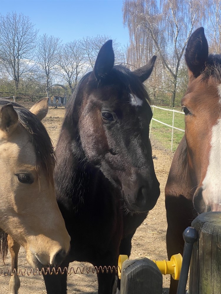 Billedsmuk sort hoppe med fantastisk sind. Velgående og nem. Går pt i løsdrift med tre andre med masser af plads og stadig græs.
