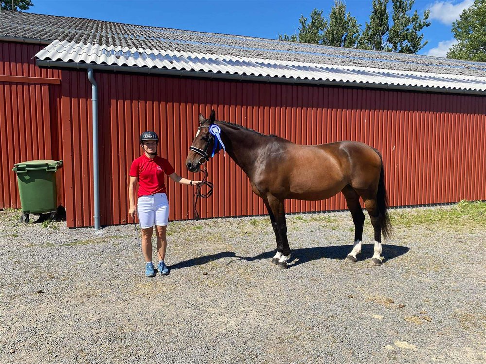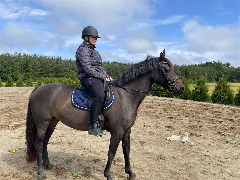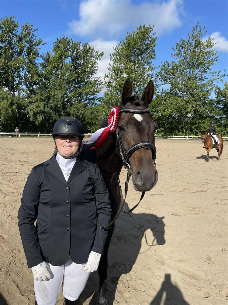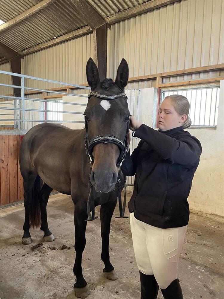 Tilredet sommer 2024 og har holdt pause indtil maj 25. Hun er igang med ridning og rides et par gange om ugen. Bliver ikke frisk eller dum af fridage. Køre trailer jævnligt og går lige i traileren. Hun er passet med smed, vacc. og ormekur. Står pænt ved smed. Hun har desuden gået et par dressurstævner, som hun har klaret fint og kigger ikke på hegn og dommerskur osv. Hun har 3 rigtig gode gangarter. Går pt. skridt og trav. Galop er påbegyndt. Har været redet i skoven og på landevej 2 gange. Siger ikke noget til biler.