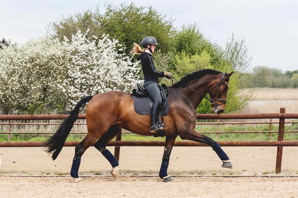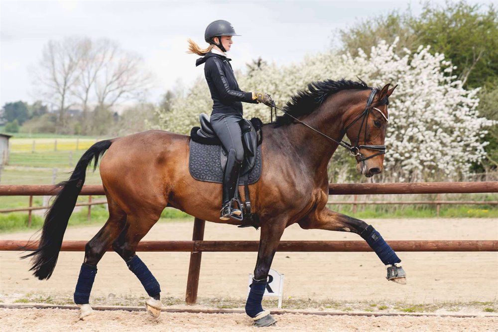 Han går altid pænt rundt, hopper eller kigger ikke, og kan sagtens give en god tur til en mindre rutineret rytter. Ønskes der arbejde med øvelser og højere samlingsgrad, kræver det dog en mere øvet rytter med teknisk formåen.