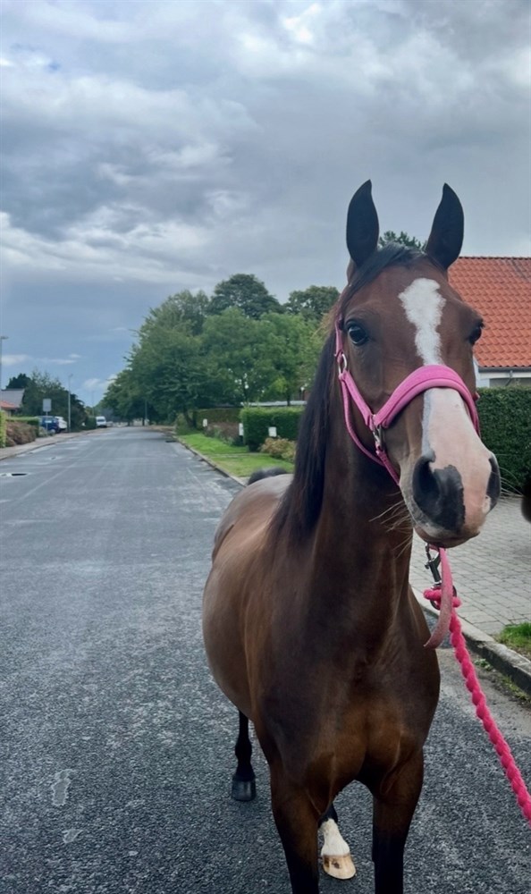 Hun kan lide at ride skovture og vi har endnu ikke oplevet, at hun ikke kan med andre heste. Vi trækker hende altid ude ved vejen, da hun er følsom overfor forbikørende biler.
