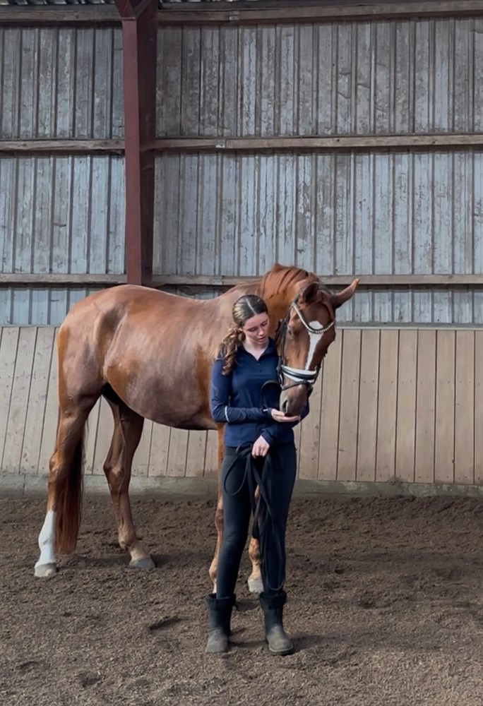 Udredning: Han er grundigt udredt af dyrlæge og på KVL med rideprøver, lokalbedøvelser og scanninger. Konklusionen er, at han ikke har smerter og ingen skader har, men formentlig har nedsat føleforstyrrelse i højre bagben, som løsner op under opvarmning. Han udviser ingen smerteadfærd under ridning.