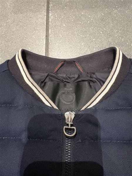 CT figursyet dunvest i navy med beige/hvidt kantbånd. Knap brugt. Vasket én gang, derfor kan man skimte dun i syninger men ellers ingen brugsspor. SÅ smuk, men må videre da den desværre er købt lige det mindste.