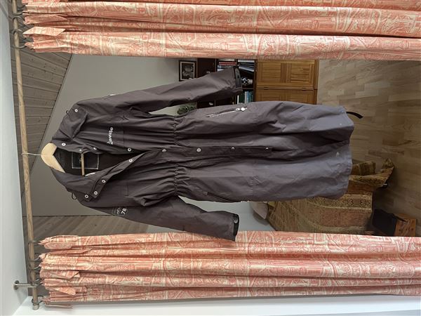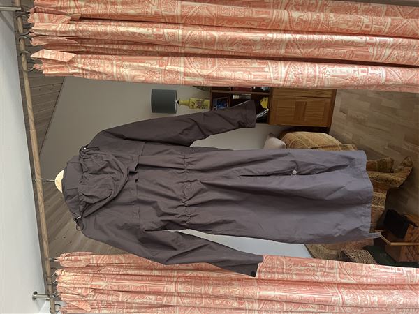 Lang mget flot funktionel brun 100% vandtæt regnfrakke med fastsyet hætte og høj krave. Ingen skader eller synligt slid.