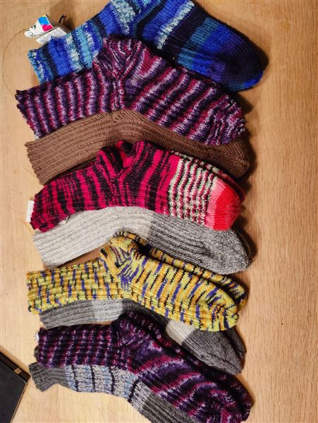 Dejlige hjemmestrikkede strømper i flotte farver.