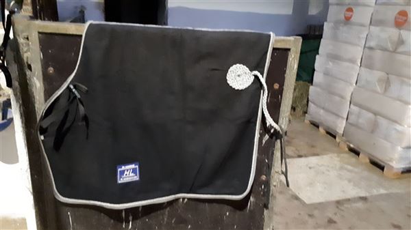 HL lændedækken i ren uld, sort med grå kant, str. full, halestrop og nedre snor, har ligget tørt og fejler ikke noget.