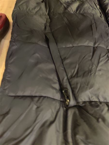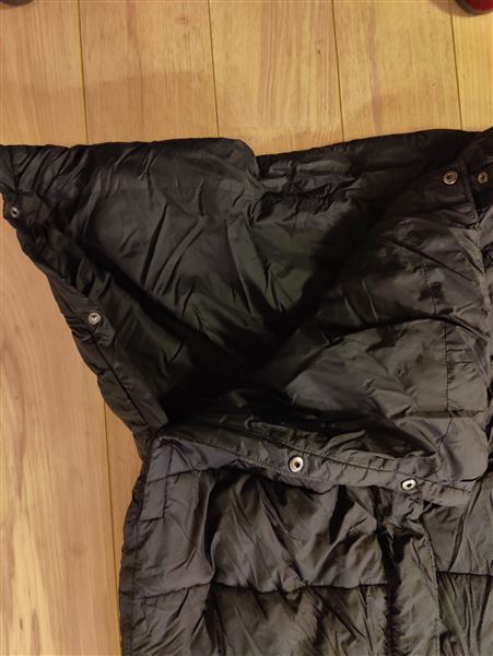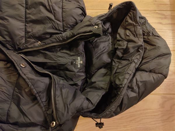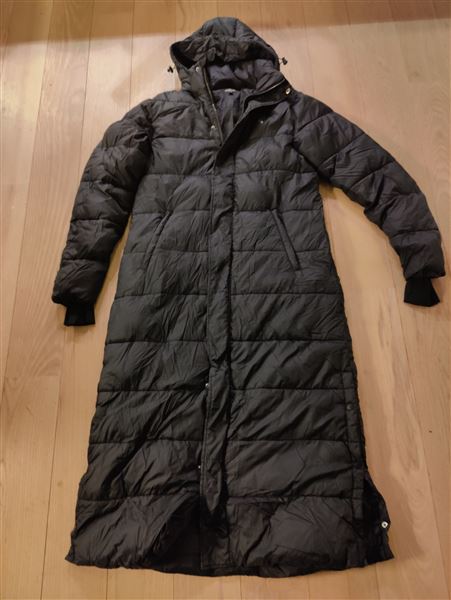 Kingsland lang dynejakke. Den har hætte med snøre, gennemgående lynlås foran med trykknapper samt ribkanter ved ærmerne. Dejlig varm helt ned over benene. Ganske lidt brugt.