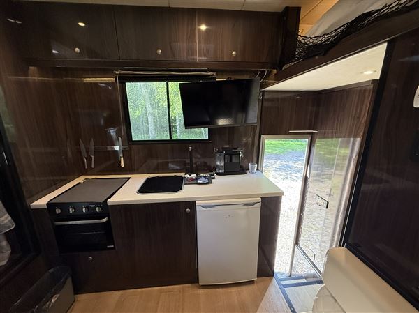 Køkken med 230v køleskab, kogplade og ovn på gas