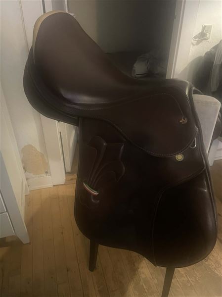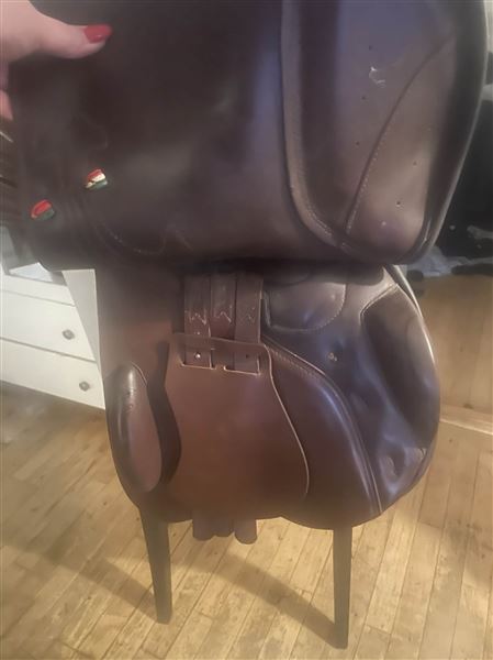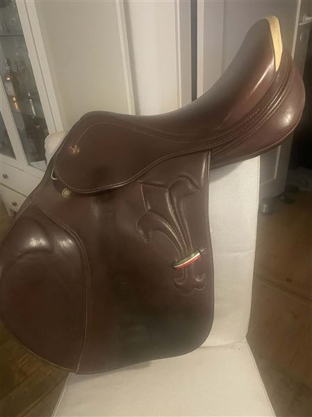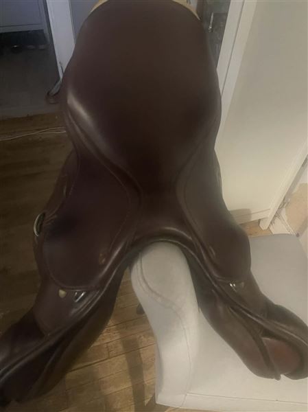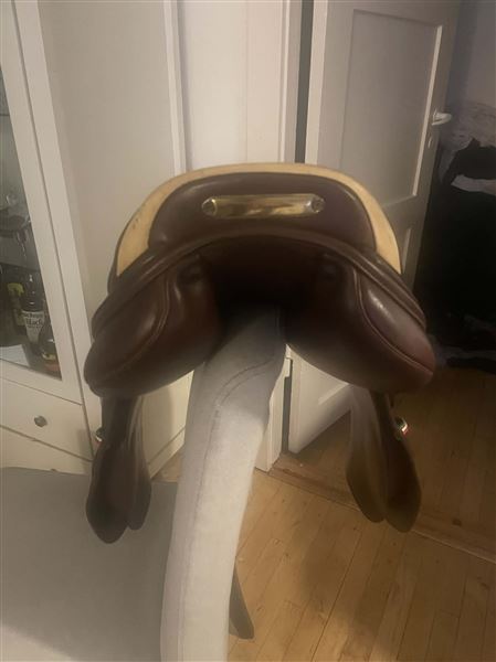 Meget flot og velholdt spring sadel fra Prestige i en smuk brun farve. 16 t og bom str 31. Bommen kan ændres af sadelmager.