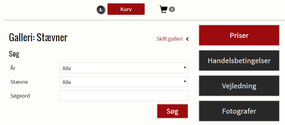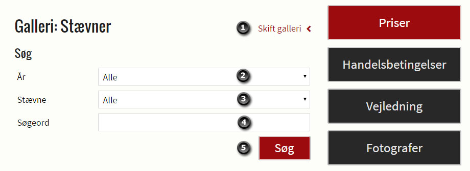 - På billedet ovenover kan du se søgefeltet hvori du kan søge blandt vores mange billeder. Her kan du vælge hvilket galleri du ønsker at se stævnebilleder fra, du kan altid se hvilket et galleri du er i, ved at kigge i overskriften til venstre for skift galleri.