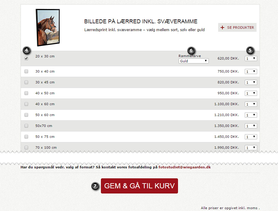 - Når du har valgt de forskellige formater for dette billede, klikker du på gem. Dernæst kommer du tilbage til oversigten af din indkøbskurv, og kan vælge formater for resten af billederne.