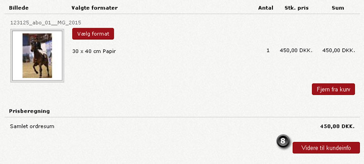 - Når du har valgt hvilke formater, du ønsker de forskellige billeder i, skal du klikke på ”Videre til kundeinfo”. Du kan IKKE gå videre, før der er valgt formater for ALLE billeder. Er der billeder, du har lagt i indkøbskurven, du alligevel ikke ønsker at bestille, skal du ud for billedet klikke på ”Fjern fra kurv”.