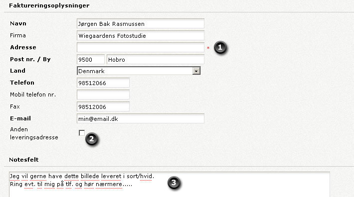 - Brug notesfeltet til at skrive hvis du har specielle ønsker til dine billeder. Vær dog opmærksom på at nogle korrektioner kan være en større proces for os. Vi vil i disse tilfælde kontakte dig vedr. pris etc.