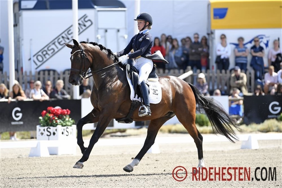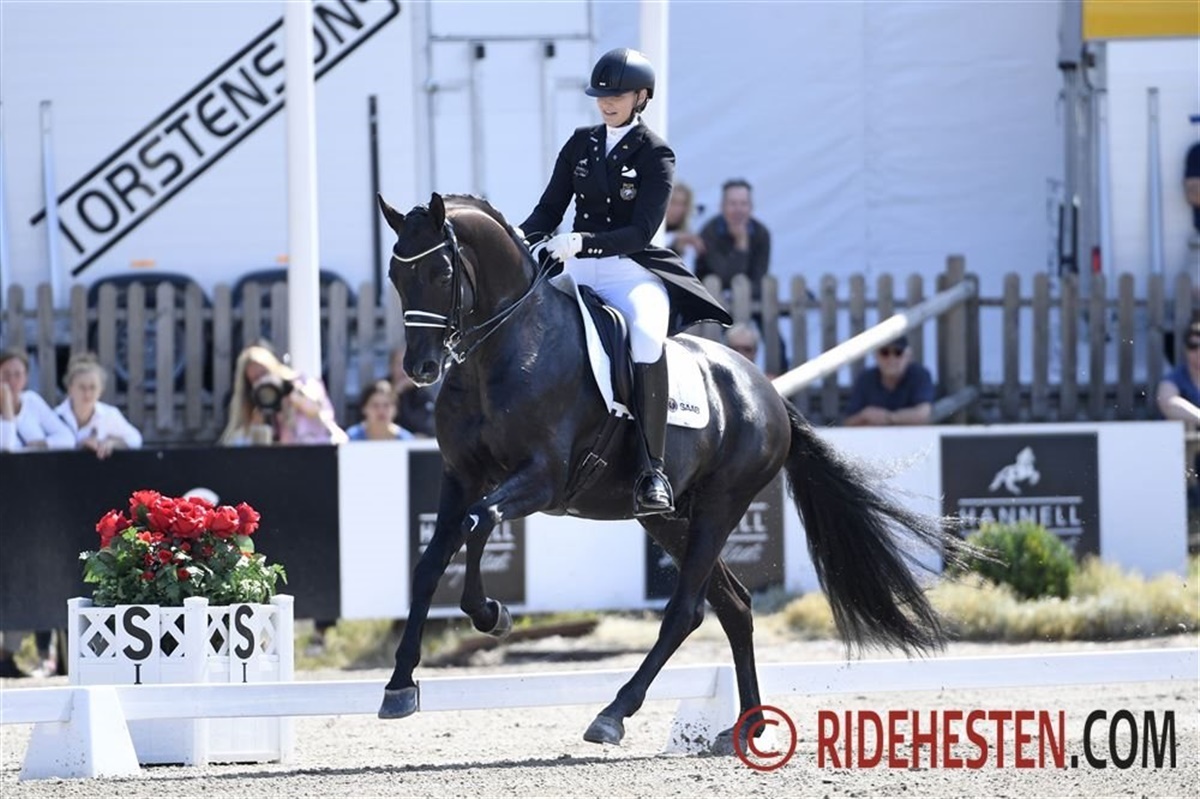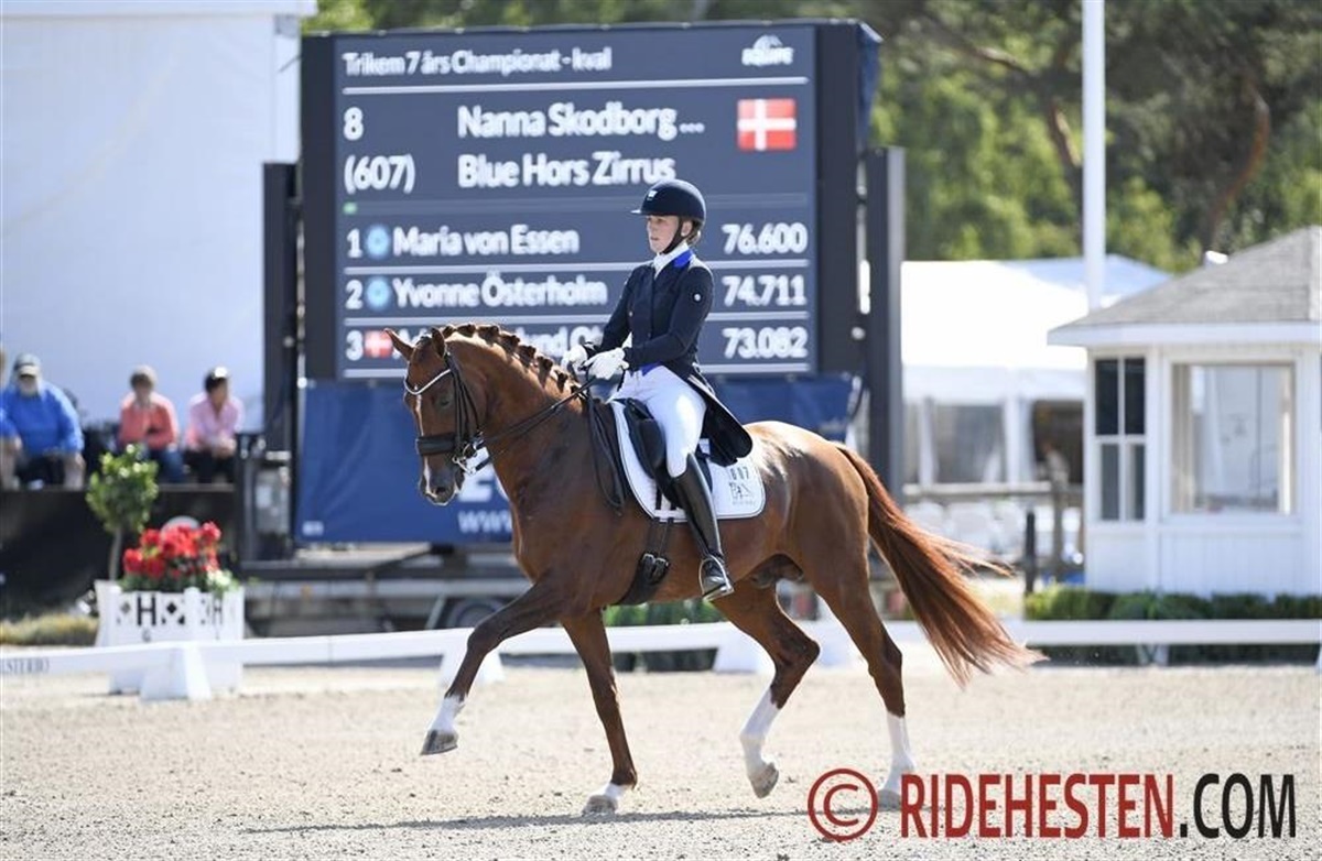 Blue Hors-rytteren Nanna Skodborg Merrald havde her til formiddag et flot og velovervejet ridt på Blue Hors Zirrus e. Blue Hors Zack/Donnerhall 11, som lagde dem klart i front. Med Nannas sirlige ridning, startede ekvipagen på absolut bedste måde ved, at indkassere et 9 tal for indridningen og fik efterfølgende 9-taller for både trav, galop, løsgjorthed og fremtid, som der gives karakterer for i det svenske 7-års program. Samlet rakte det til 81,66% og de resterende ryttere skulle derfor ride til for at nå i nærheden af Nanna og Zirrus.