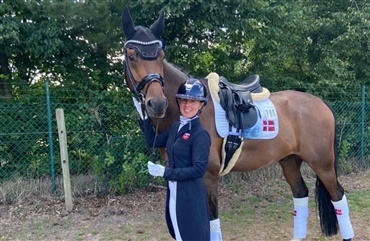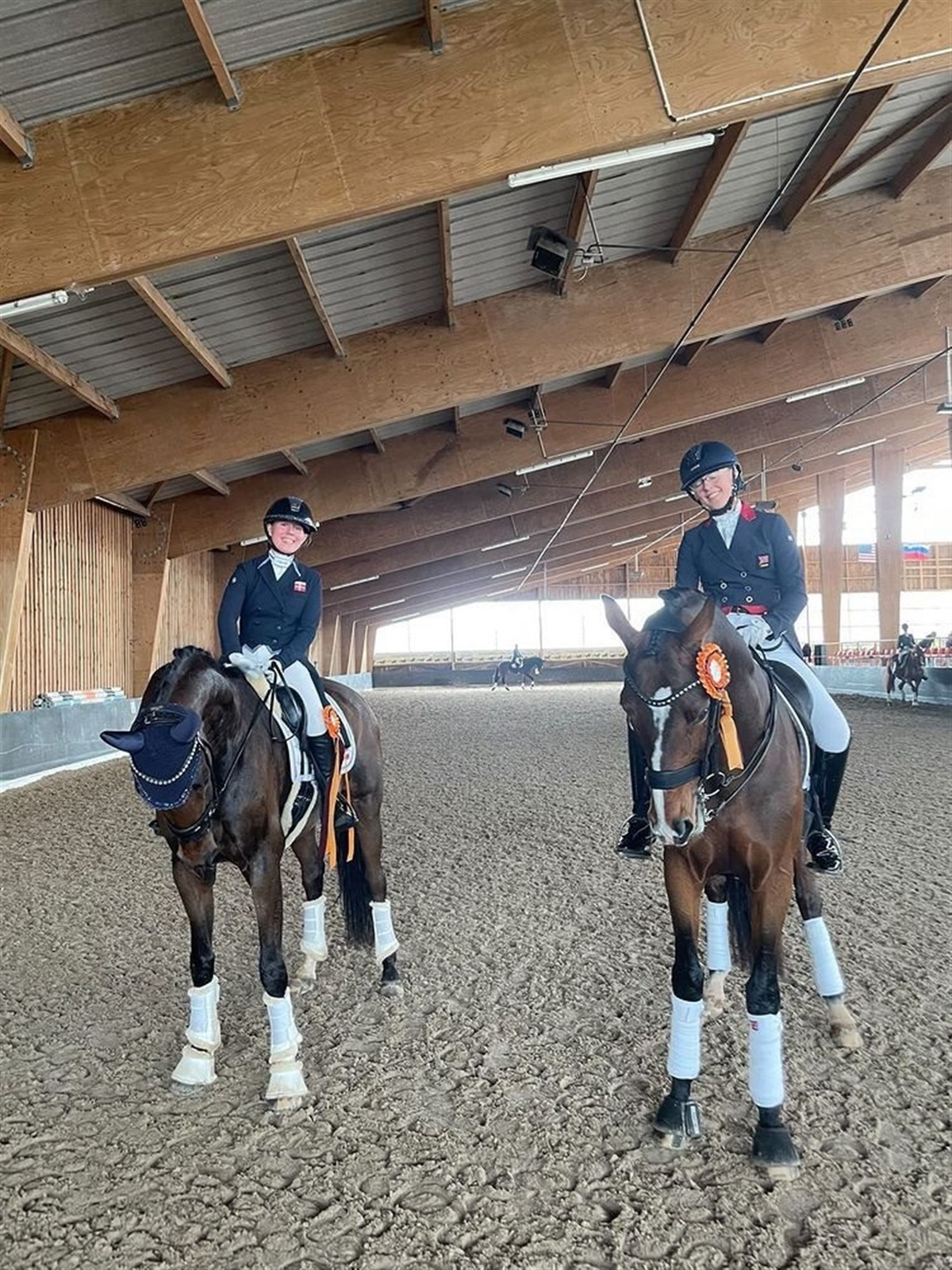 Med sig har hun to heste. Den 9-årige, brune hoppe Fleurie e. Fürstenball/ Onassis (opdr. Sippekildegård) har været til start i ungrytterklasserne, fordi Karoline allerede nu er ved at øve sig på næste niveau, idet hun pga. alderen rykker op i det nye år. I fredags red hun sig til en sjetteplads med hoppen, og i dag startede hun ud med at ride en flot andenplads hjem i ungrytternes kür med 69,160%.