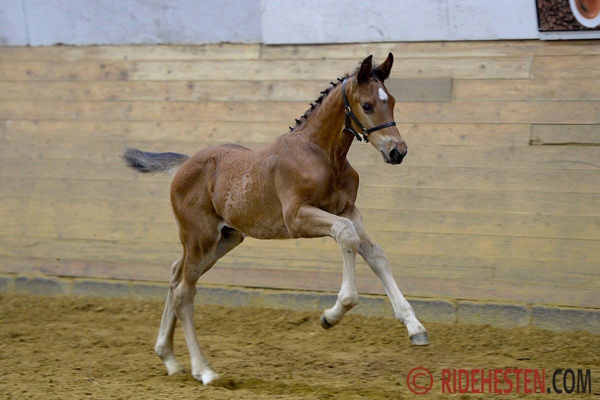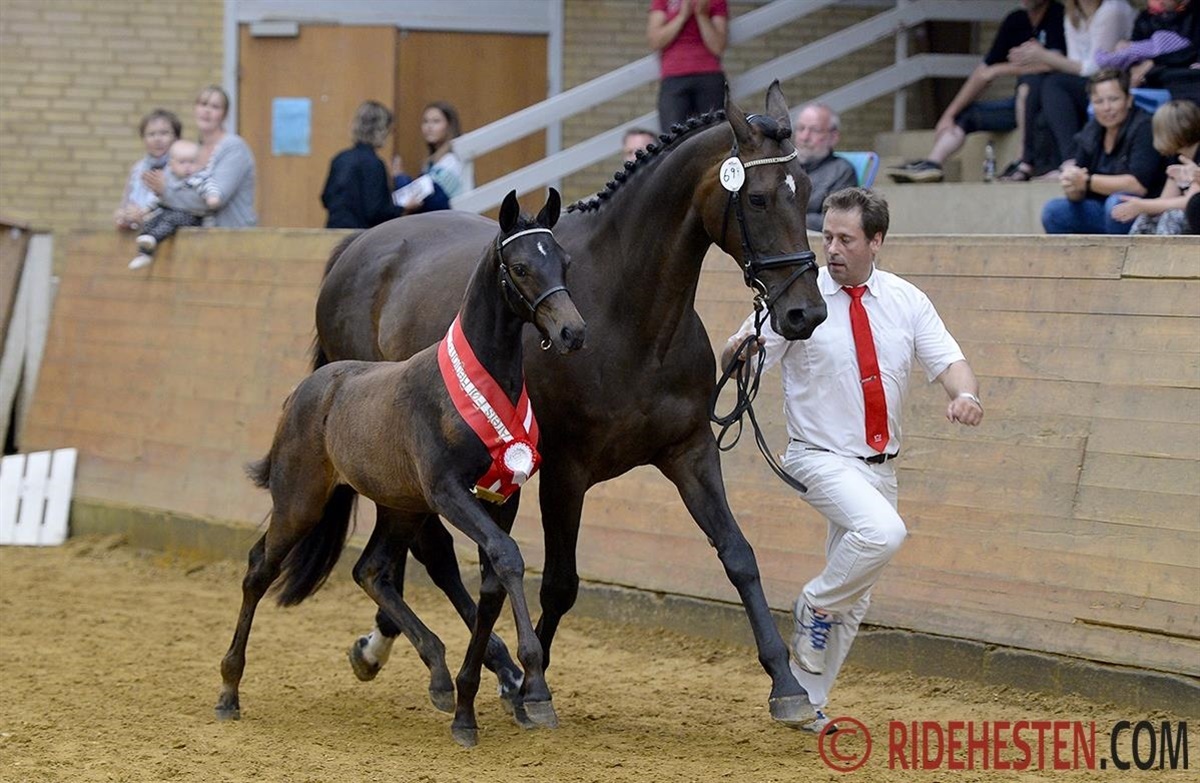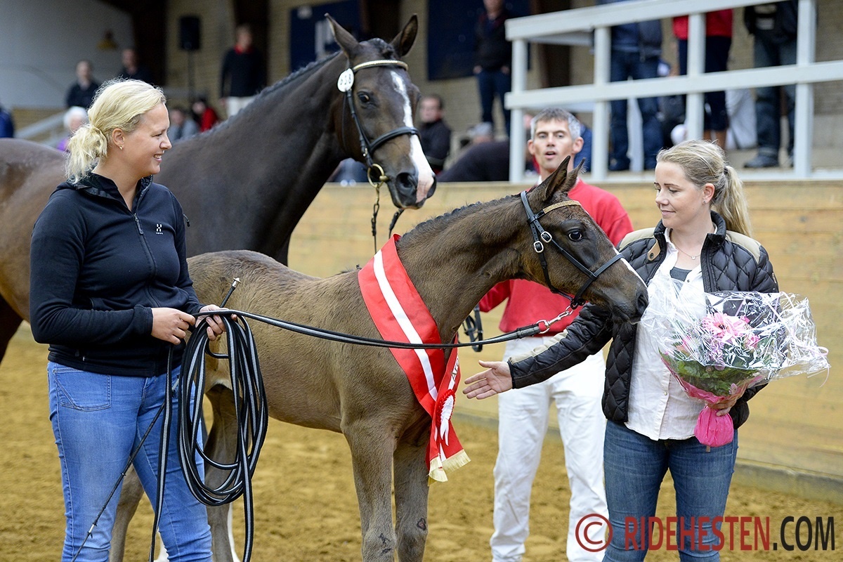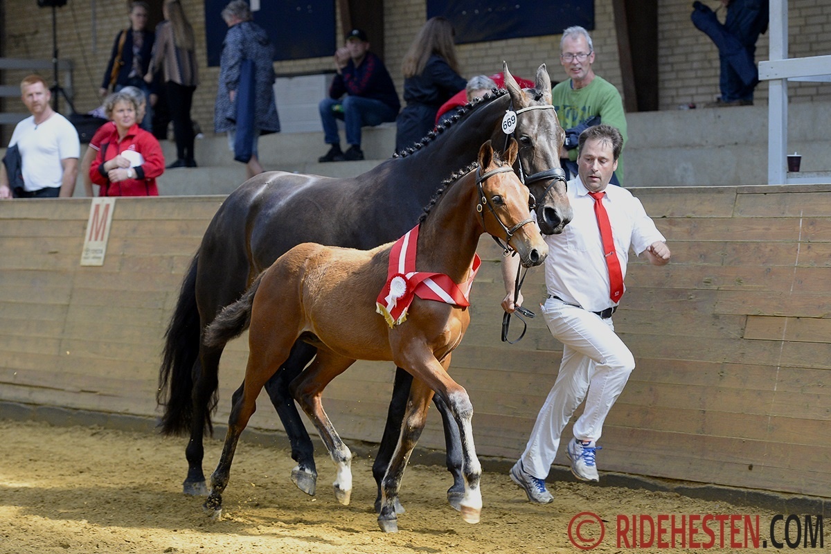 Bedste dressurbetonede hoppeføl blev altså katalog nummer 694, Vianna e. Fürstenball/Blue Hors Romanov, avlet og ejet af Erik, Lena og Ulrik Kristensen. Hoppen blev blandt andet belønnet med flotte 10 point for trav, og 9 for galop, og kunne få stemningen helt op under taget da hun travede triumferende rundt med det flotte, røde bånd om halsen under æresrunden. Andenpladsen gik til katalog nummer 674, EQ Fallulah e. Fürstenball/Quaterback, avlet og ejet af Susanne Oldenborg. Reservepladsen gik til katalog nummer 658, Heiline’s Vianna e. Blue Hors Rockefeller/Lorentin I, avlet og ejet af Stald Heiline.