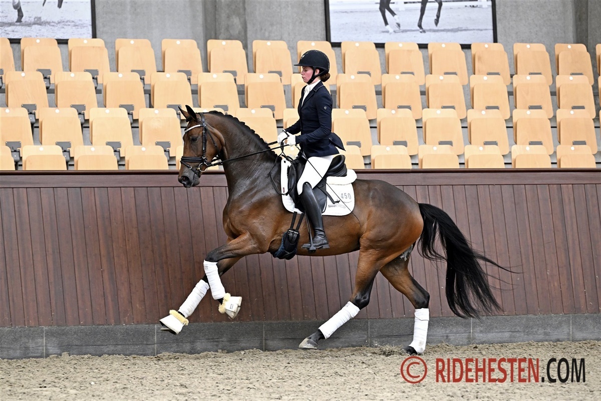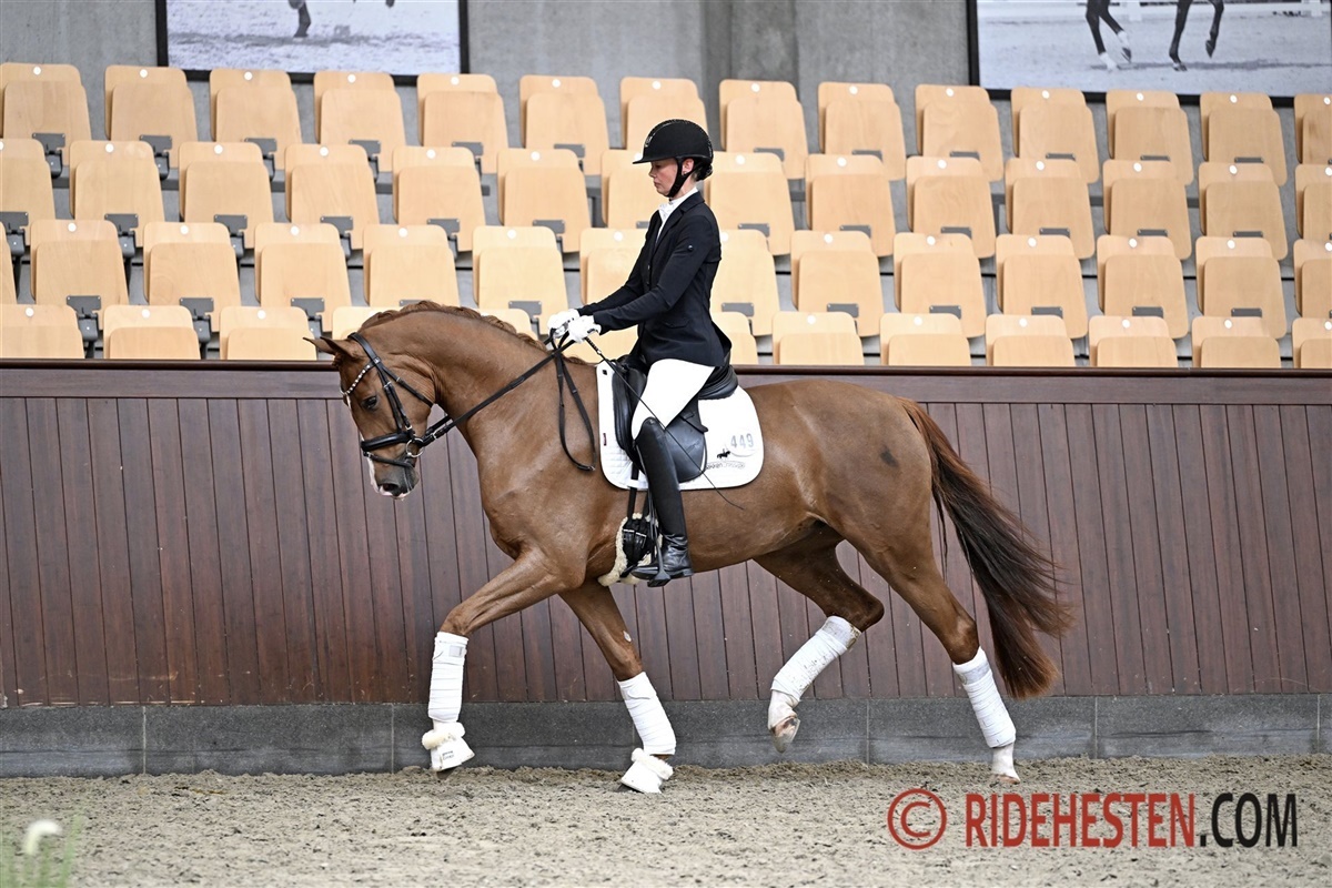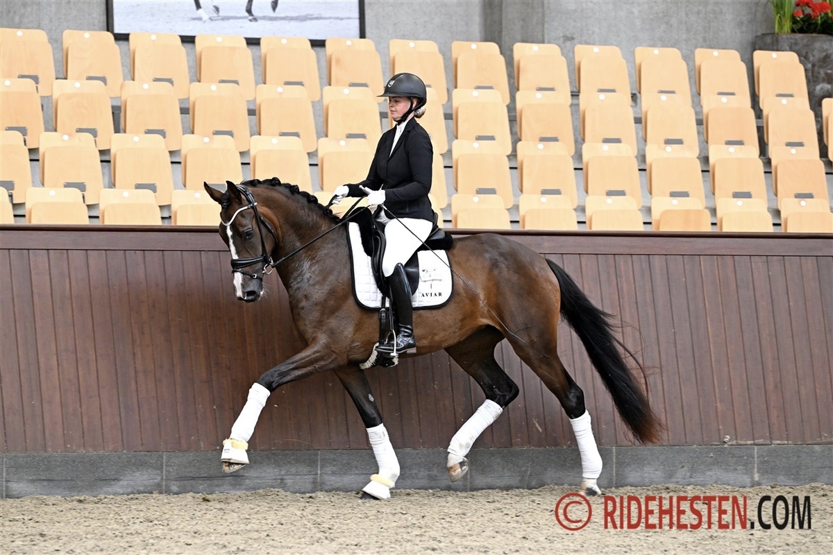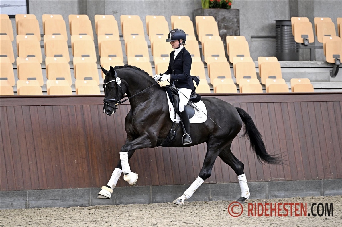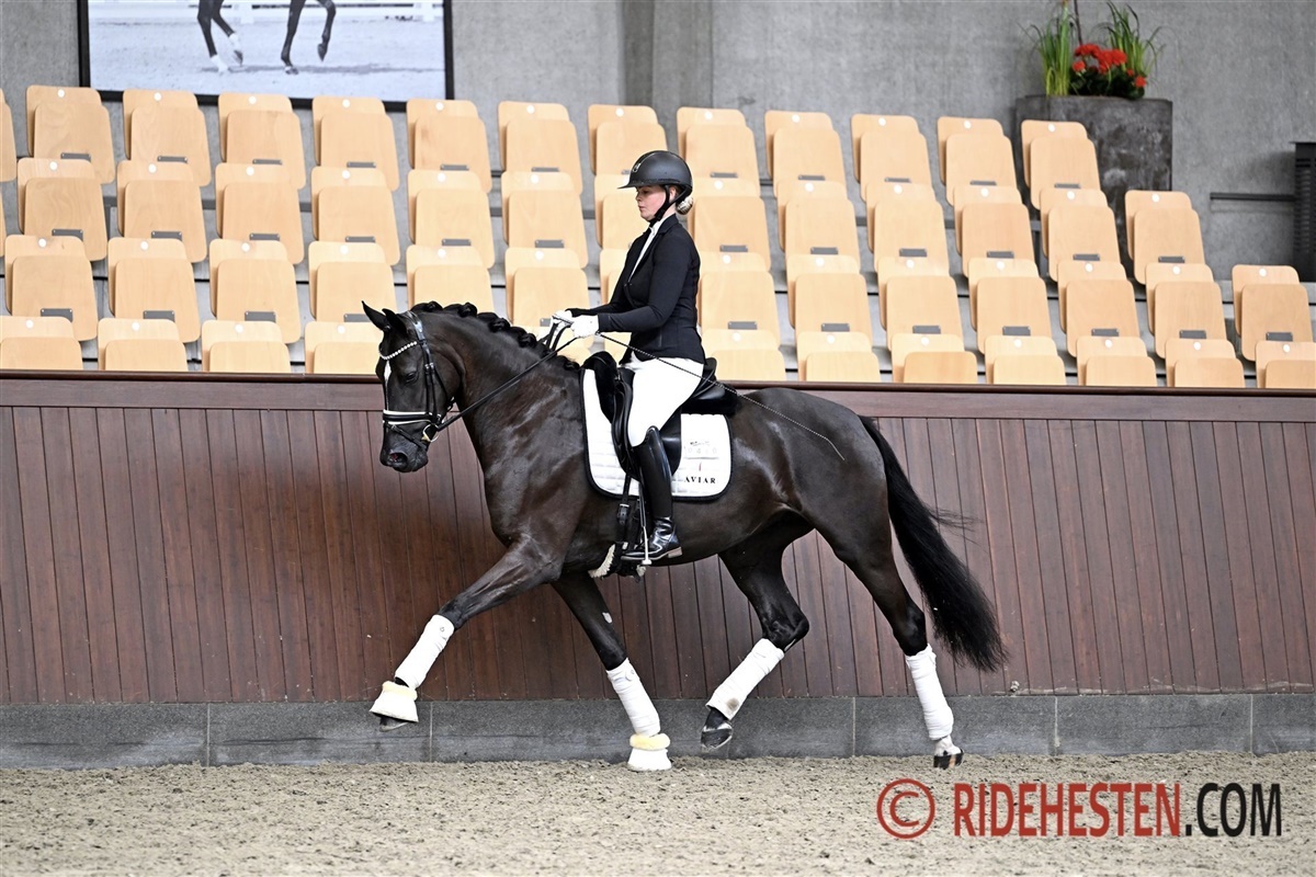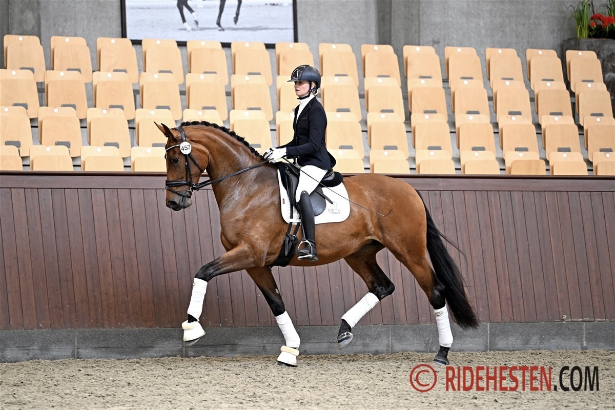 Kat. 450 Kild’s Roxanne DWB e. Revolution/Ampère født hos Lone Fredskild og ejet af Henrik Petersen Holding i Gram. Om hende bemærkede Else Lieback, at man hos enkelte af hopperne i finaleringen kunne ønske sig mere ædelhed, men Kild’s Roxanne præsenterede sig med en flot ædelhedsgrad, dejligt højtstillet og med god harmoni i kropspartierne. En velrejst hoppe, utrolig smuk, og hun aflagde en god rideprøve med 8,5 i kapacitet og galop.