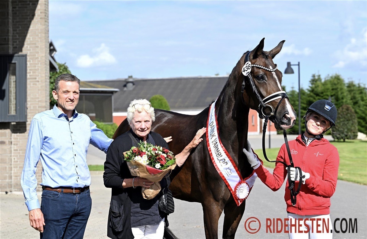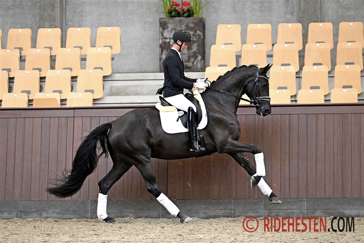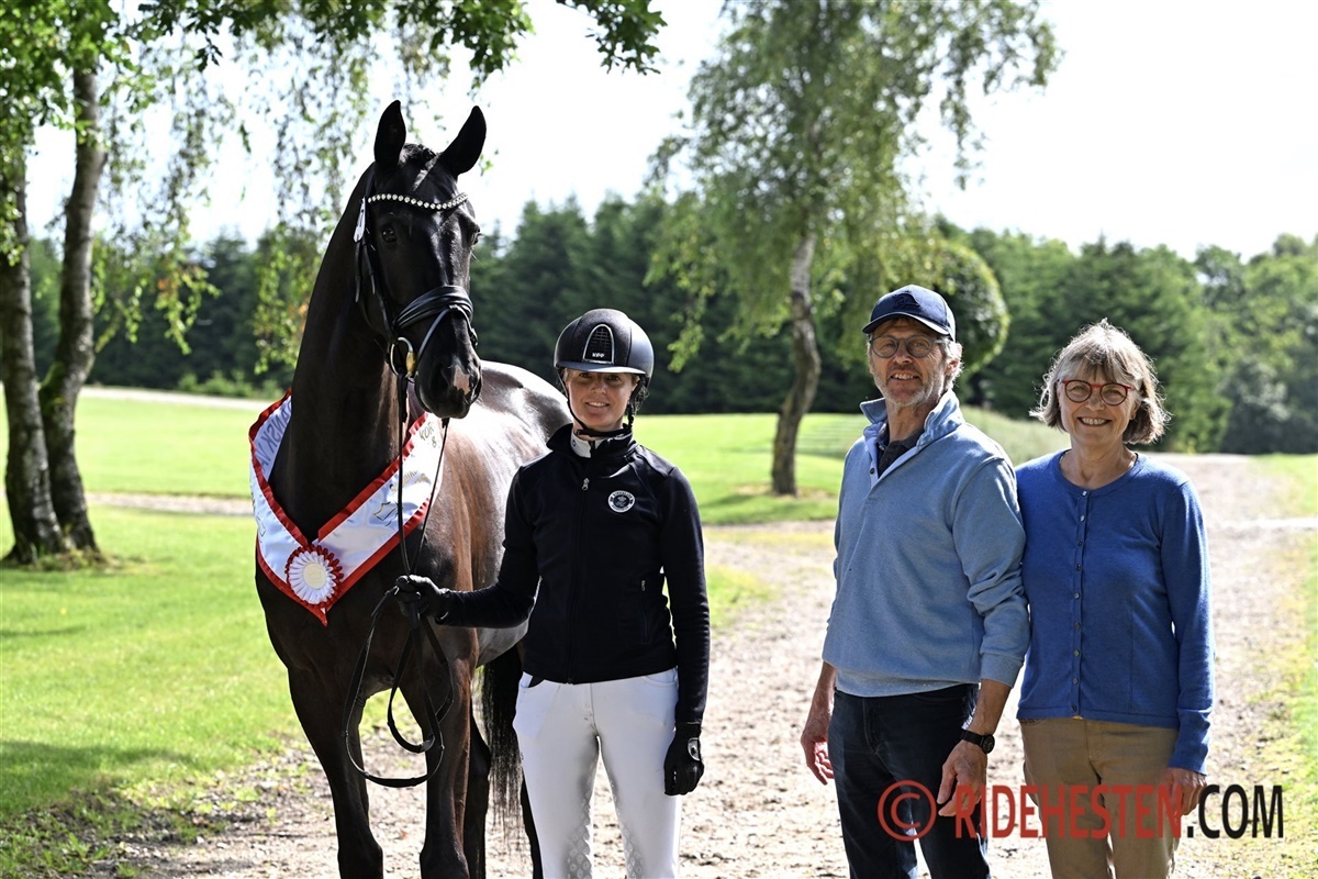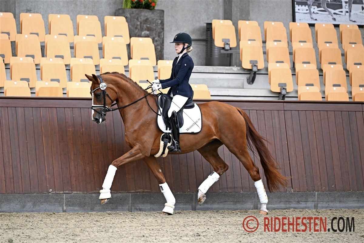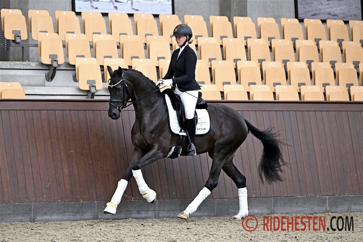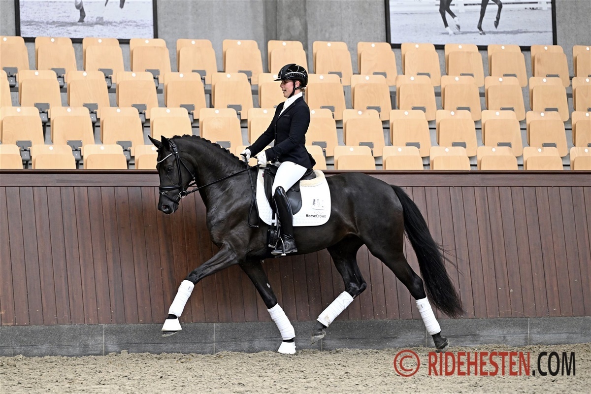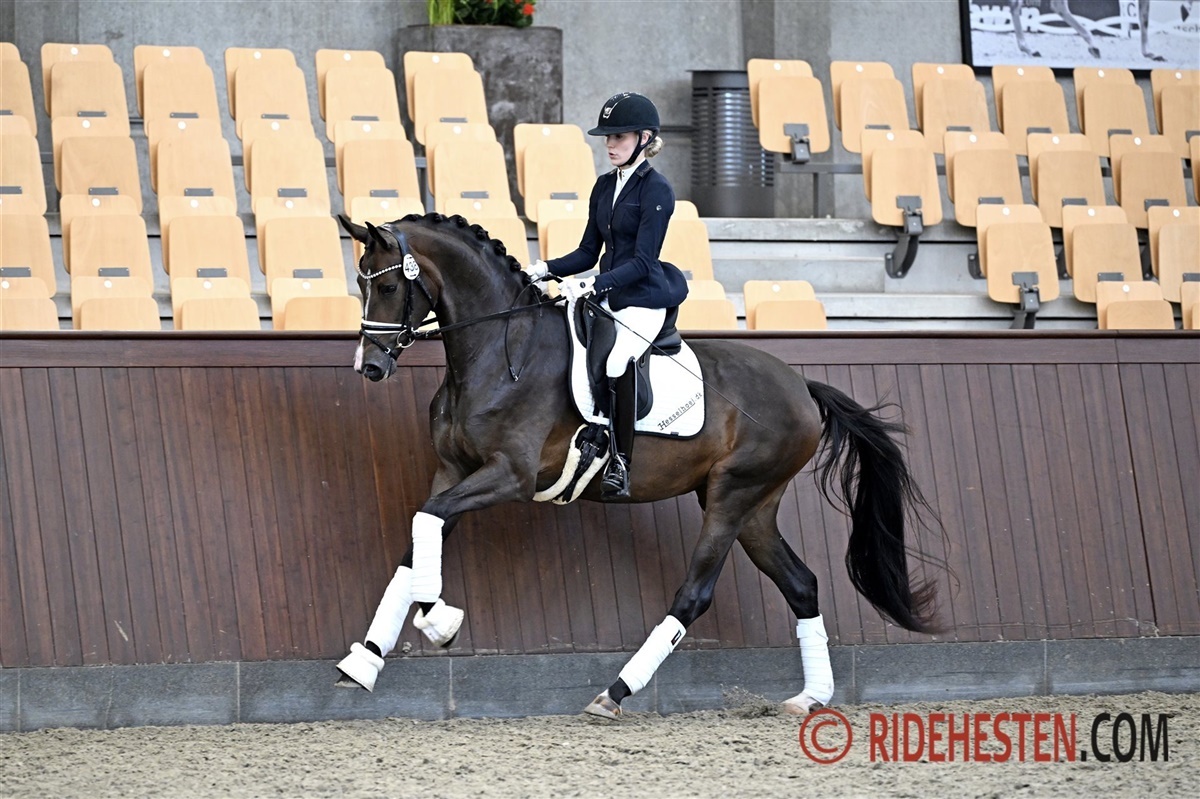 Kat. 450 Kild’s Roxanne DWB e. Revolution/Ampère født hos Lone Fredskild og ejet af Henrik Petersen Holding i Gram. Om hende bemærkede Else Lieback, at man hos enkelte af hopperne i finaleringen kunne ønske sig mere ædelhed, men Kild’s Roxanne præsenterede sig med en flot ædelhedsgrad, dejligt højtstillet og med god harmoni i kropspartierne. En velrejst hoppe, utrolig smuk, og hun aflagde en god rideprøve med 8,5 i kapacitet og galop.