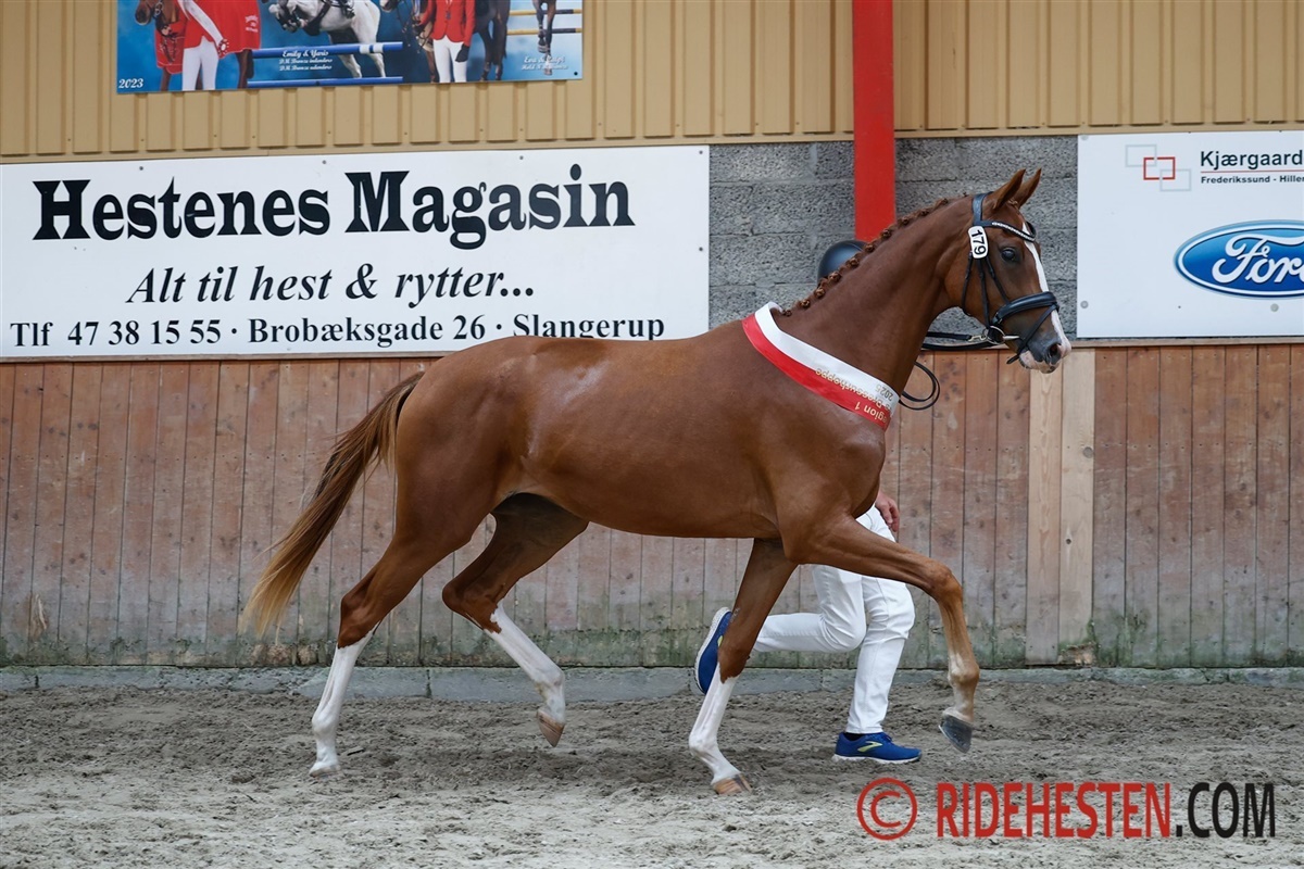 Et hingsteføl, vi var meget begejstrede for. Han er storrammet med gode partier, har et herligt maskulint præg og er meget udtryksfuld. Halsen er velansat og velformet, og skulderen er lang, skrå og velplaceret. Han står på korrekte og velmarkerede lemmer. Føllet opnåede dagens højeste galopkarakter på 9 for en galop præget af balance, rummelighed, power og aktion.