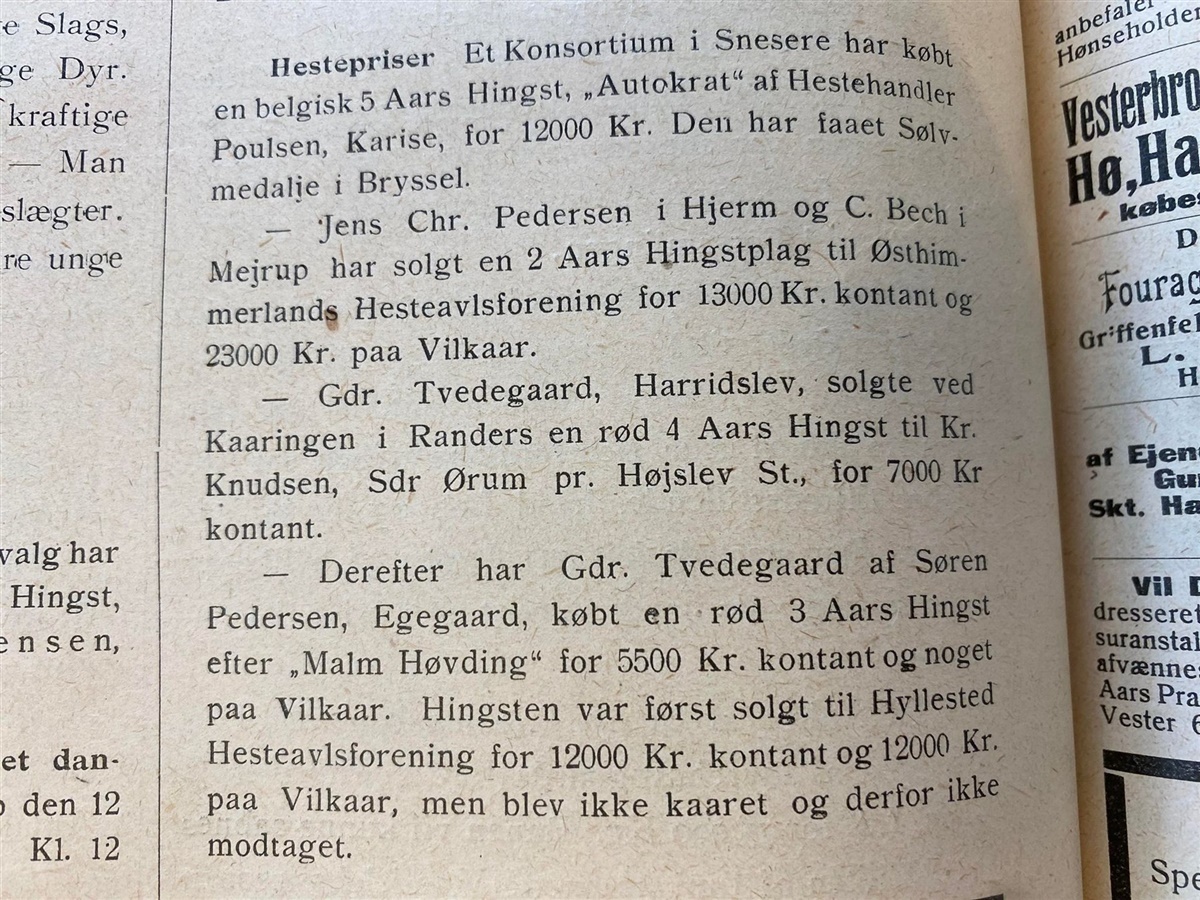 Ligeledes havde Jens Christian Petersen i Hjerm og C. Bech fra Mejrup solgt en hingsteplag på to år til Østhimmerlands Hesteavlsforening. Plagen indbragte 13.000 kr. kontant og 23.000 kr. på vilkår.