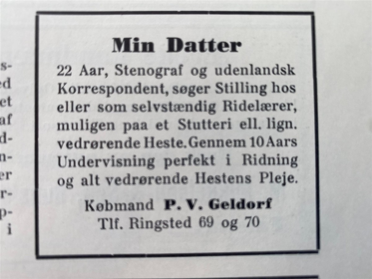 I vores tid er det så naturligt, at det kan være svært at forestille sig at det nogensinde har været anderledes. Men tilbage i 1948 var ridesporten endnu ikke blevet noget som kun civilister dyrkede og mange af de dygtige ridelærere var mænd og militærpersoner. Så for at hjælpe sin 22-årige datter med at finde en stilling som ridelærer indrykkede købmand P. V. Geldorf fra Ringsted en annonce på vegne af datteren. Om hun fik en stilling som ridelærer ved vi desværre ikke.