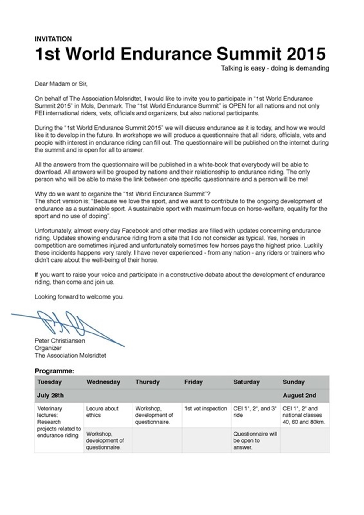 Foreningen Molsridtet har udsendt en invitation til 1st World Endurance Summit 2015, som vil være åbent for alle nationer, og hvor man vil diskutere distancesporten, som den er i dag, og hvordan man ønsker, den skal udvikle sig i fremtiden. Man vil bl.a. arbejde i workshops og udarbejde spørgeskemaer.