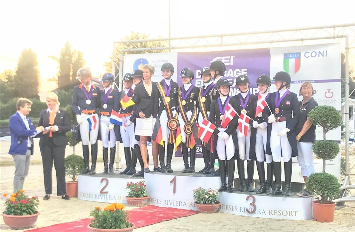Første halvdel af holdmesterskabet blev redet i går, hvor to ud af de fire holdrytter i alle alderkategorier var til start. Her lagde juniorrytterne sig til bronze og da de sidste to rytter havde redet i dag var det sikkert - bronzen var i hus! Resultatet bliver udregnet på den måde at de tre bedste resultater bliver lagt sammen også findes der en gennemsnitprocent. Her var de tyske ryttere helt i særklasse, da de tog guldet med et gennemsnit på 76.081% efterfulgt af Holland med 73.485% og så Danmark med 71.959%.