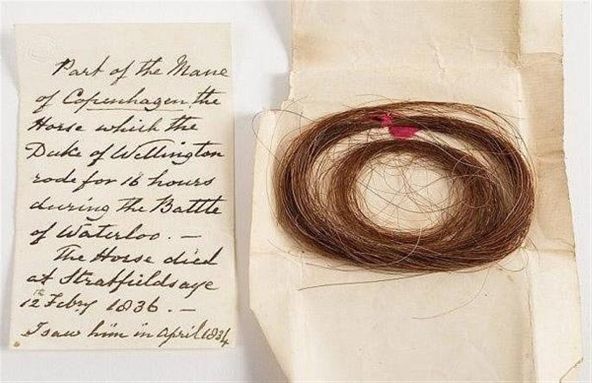 Manhårene var fra hesten Copenhagen, hvis rytter var ingen ringere end hertugen af Wellington, hvilket gør manhårene ca. 200 år gamle.