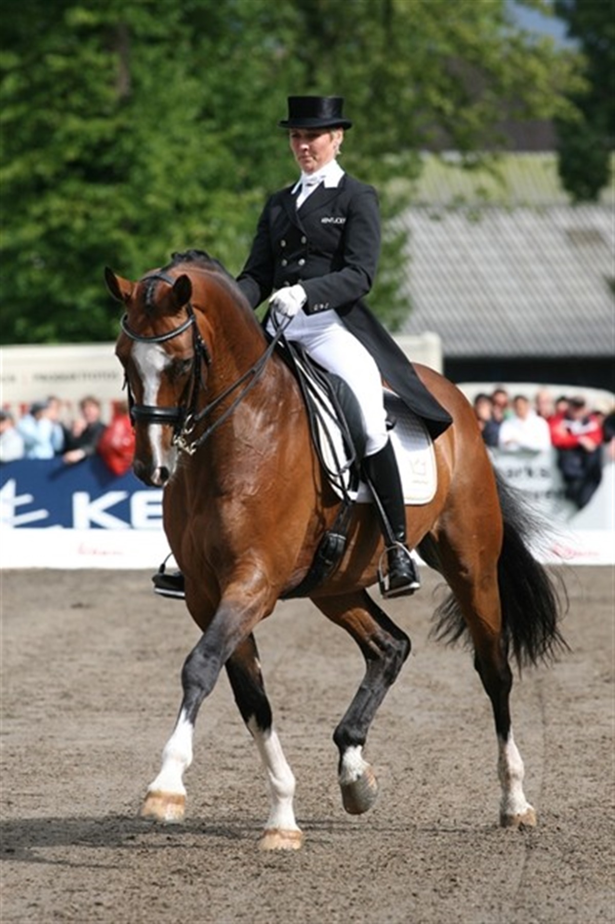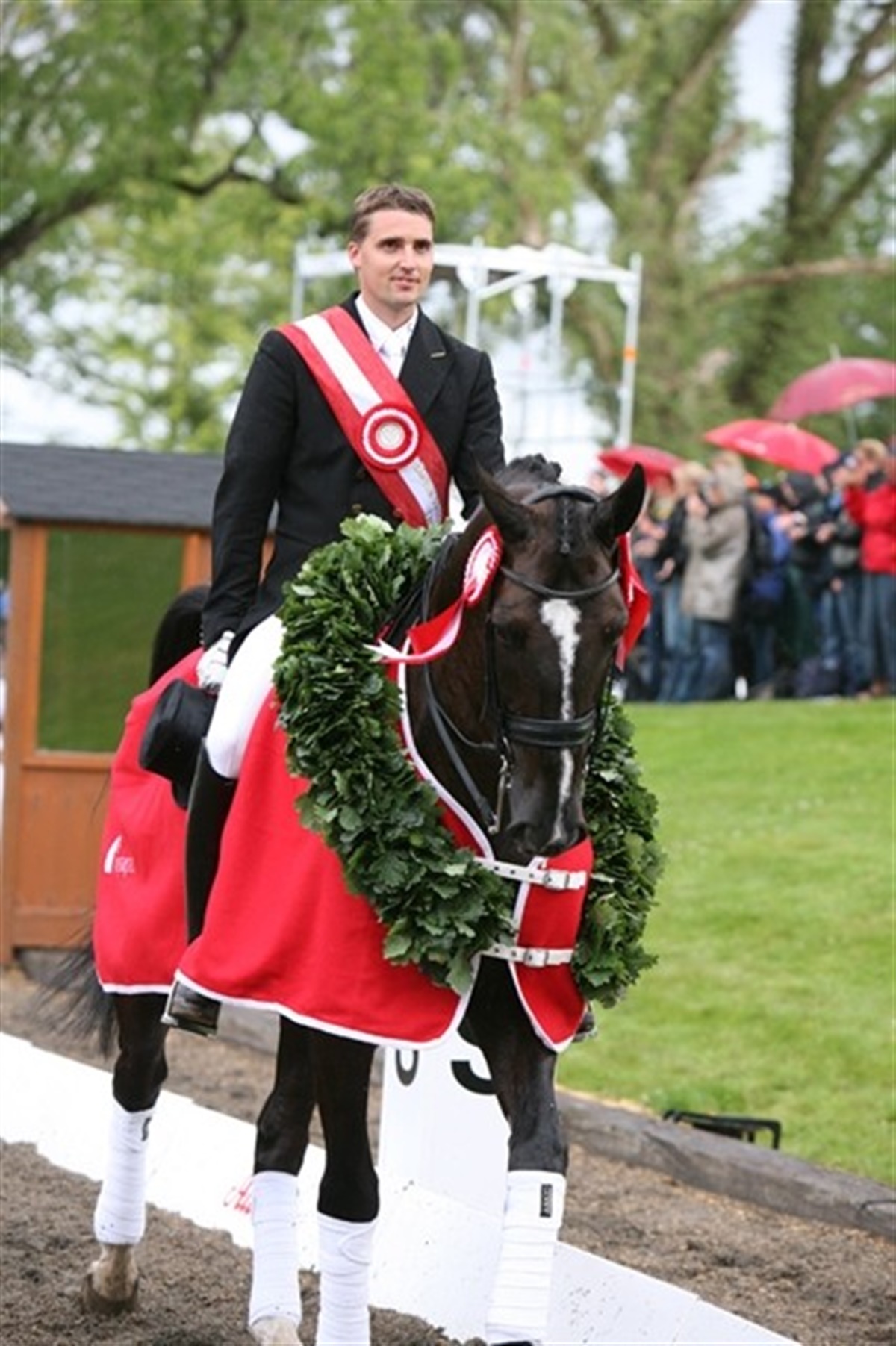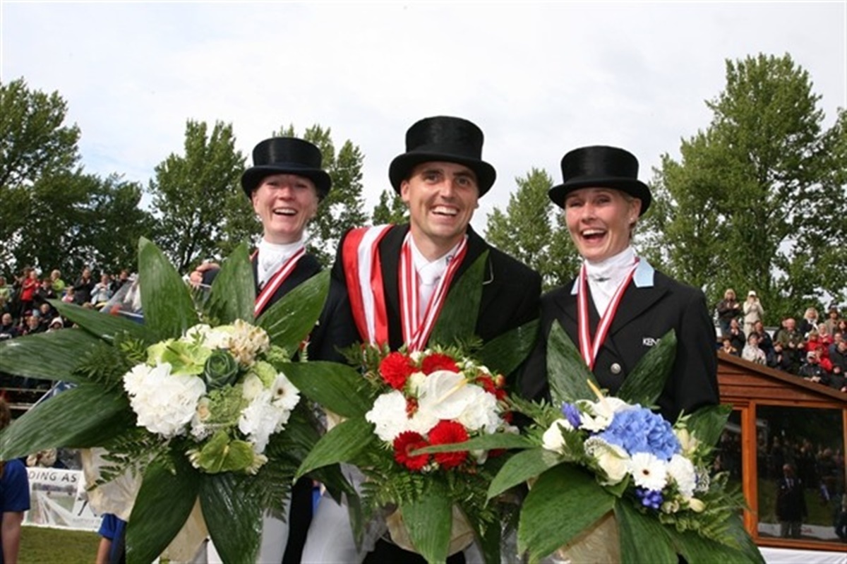 Først sejrede han på Blue Hors Cavan, så vandt han på Blue Hors Matine og i år scorede Andreas Helgstrand hattrick ved at vinde sit tredje danske mesterskab i dressur - på en helt tredje hest, nemlig den kun 8-årige vallak Gredstedgårds Casmir. Trods silende regn over Broholm et par gange under mesterskabskonkurrencen holdt pulikum ud til den sidste, festlige præmieoverrækkelse. Publikum blev også belønnet med et mesterskab af særdeles høj klasse, specielt de fem ryttere, som landstræner Rudolf Zeilinger udpegede til EM-holdet umiddelbart inden kürfinalen, gav publikum en uforglemmelig dressuroplevelse. Der var hård kamp om mestekabet i år, idet de bedste fem ryttere, lå placeret særdeles tæt efter fredagens Grand Prix og lørdagens Special. Sanne Henningsen og Clearwater S leverede en fremragende kür i dag, og sikrede sig sølvmedaljen og en plads på EM-holdet. Prinsesse Nathalie lå på 4. pladsen med Digby, Rigoletto, der bliver prinsessens EM-hest blev hjemme i Berleburg med en let kolik. Efter en næsten fejlfri kür med flot passage og en piaffe næsten efter lærebogen, red prinsessen sig ind på bronzepladsen på bekostning af den sidste landholdsrytter Joachim Thomsen og Mikado Engvang, som brillierede med især flotte piruetter og passage. Anders Dahls 17-årige Afrikka var i absolut topform på Broholm, og de var en nydelse at følge i deres kür, som havde en høj sværhedsgrad, parret blev udtaget som reserve til EM og sluttede DM på 5. pladsen. DM 2007 1. Andreeas Helgstrand 2. Sanne Henningsen 3. Nathalie Zu Sayn Wittgenstein 4. Joachim Chr, Thomsen 5. Anders Dahl 6. Joan K. Jensen 7. Hanne Bruun Ejlersgaard 8. Linda Pfingstl Aasted 9. Susie Fastrup 10. Henrik Jørgensen 11. Gry Heitmann