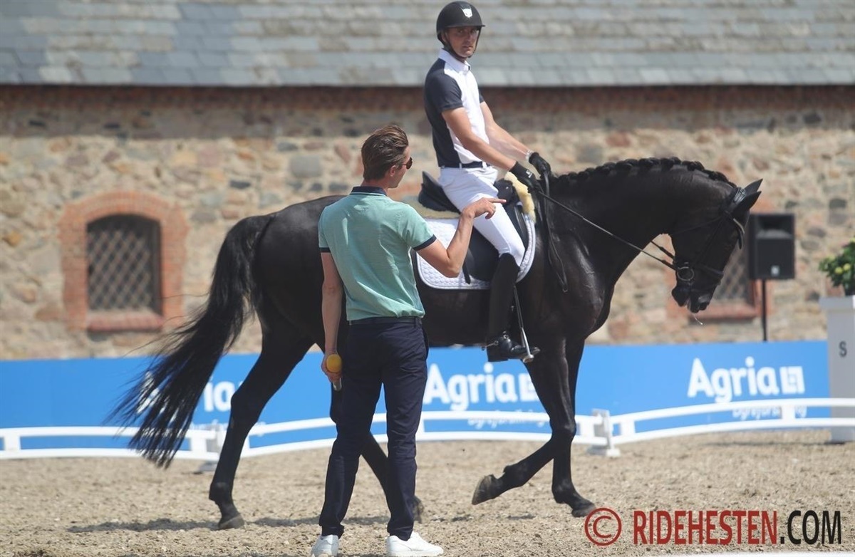 Andreas Helgstrand får respons af Dennis Fisker for sit ridt på 6-årige Zhaplin Langholt.