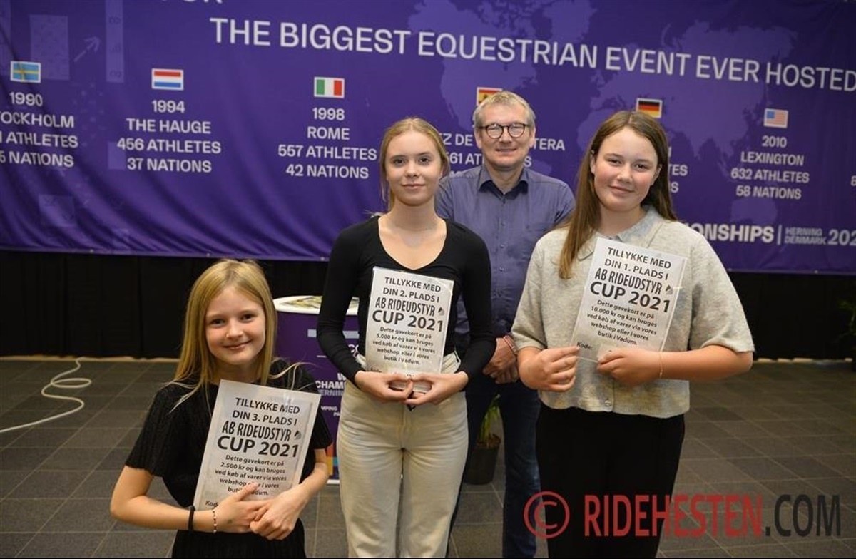 Ved middagstid i dag, lørdag, til World Cup i Herning blev de tre piger, der gennem hele sæsonen har samlet flest point, hyldet af familie, venner og tilskuerne, og de fik overrakt et gavekort af Bent fra AB-Rideudstyr.