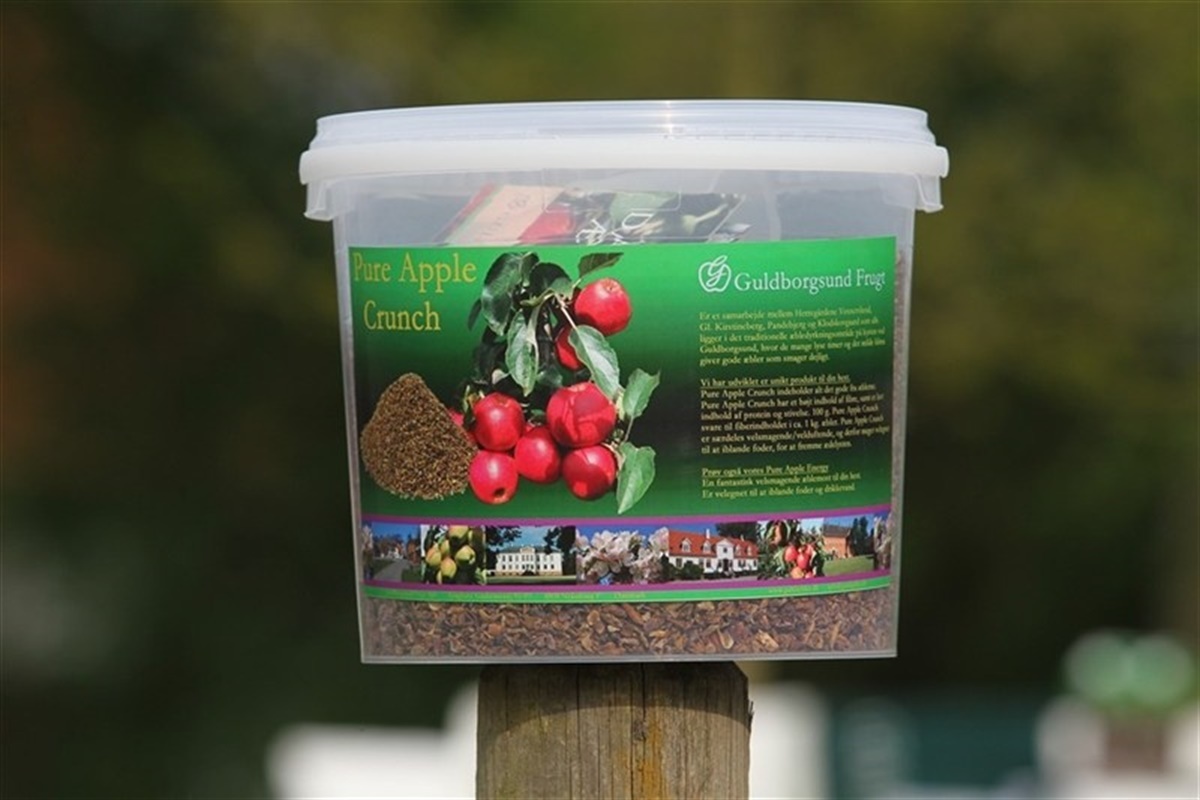 Hos Guldborgsund Frugt på Falster produceres fantastiske æbler og ikke mindst æbelmost – til mennesker – men nu har folkene bag virksomheden startet en nicheproduktion med produkter til heste. Idéen med at lave æbleprodukter til heste, og dermed bl.a. udnytte restprodukterne fra presningen til most, kom især fra Birgitte Wibholm Nobel, der sammen med sin mand, Ulrik Nobel, driver Klodskovgaard, der er en af de fire herregårde i virksomheden Guldborgsund Frugt. Birgitte datter, Alexandra, er aktiv springrytter på landsplan og Birgitte har tit oplevet at æblejuice bliver brugt til at få heste til at drikke eller spise mere fx til stævner, og derfra opstod idéen til at bruge restproduktionen æblemost-produktionen til at lave noget til heste. Mosten er et helt rent naturprodukt, der ikke er tilsat konserveringsmidler, sukker, aromastoffer eller lign., den består kun af æbler. Foreløbigt laves der tre æbleprodukter til heste: ”Pure Apple Energy”, der er en most der kan blandes i drikkevand eller foder eller gives i ren form, ”Pure Apple Crunch”, der består af tørret, findelt æble, så det der bliver tilbage fra produktionen af most bliver brugt og intet går til spilde, og endelig laves der også hestebolsjer ”Pure Apple Goodies”, der udelukkende består af æble og hvedeklid. Ingen af produkterne er tilsat sukker eller nogen former for tilsætningsstoffer, og bortset fra hestebolsjerne, består de udelukkende af æble. – Mosten til heste er en blanding af de forskellige typer most vi laver til mennesker, forklarer Birgitte. – Den er fantastisk at blande i vandet og foderet når man fx er til stævner, og hesten ikke vil spise eller drikke nok, og så giver den et helt naturligt energi-boost, fortæller Birgitte, der selv har haft rigtig gode erfaringer med mosten, bl.a. til Alexandras konkurrenceheste. Æblecrunchen laves af restproduktionen fra presningen af most. Crunchen består af dele fra hele æblet, altså både frugtkød, skrog og skræl, der bliver findelt og tørret. Det giver et meget fiberholdigt produkt, der stort set ikke indeholder sukker, protein eller stivelse. – Fiberindholdet i 100 g af crunchen svarer til fiberindholdet i ca. 1 kg æbler, så det er et produkt, der virkelig stabiliserer fordøjelsen, fortæller Birgitte. Crunchen kan gives sammen med hestens almindelige foder for at gøre det ekstra velsmagende, den kan bruges som snack eller som ”lokkemad” hvis hesten ikke vil spise foder med fx et pulvertilskud, eller medicin. Gives crunchen sammen med vådt foder som fx mash, vil æblesmagen og aromæn blive endnu mere udtalt. Sidste nye skud på produktstammen er hestebolsjer. Æblebolsjerne består af 75% æble og 25% hvedeklid – og intet andet.