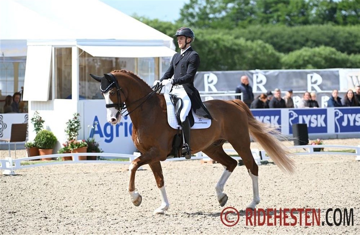 Ida Kirstine Bjørn, der i disse dage jonglerer både DM-stævne og studentereksamen, puster Alexander godt og grundigt i nakken efter et flot ridt i dag, der gav hende og Hussmanns Jackson e. Johnson/ Belissimo M (opdr. Stald Hussmann) 70,302%.