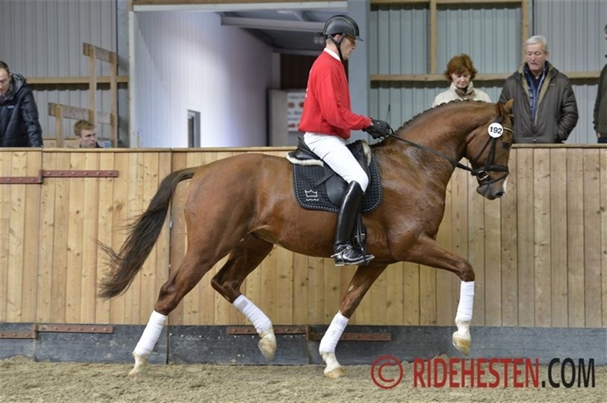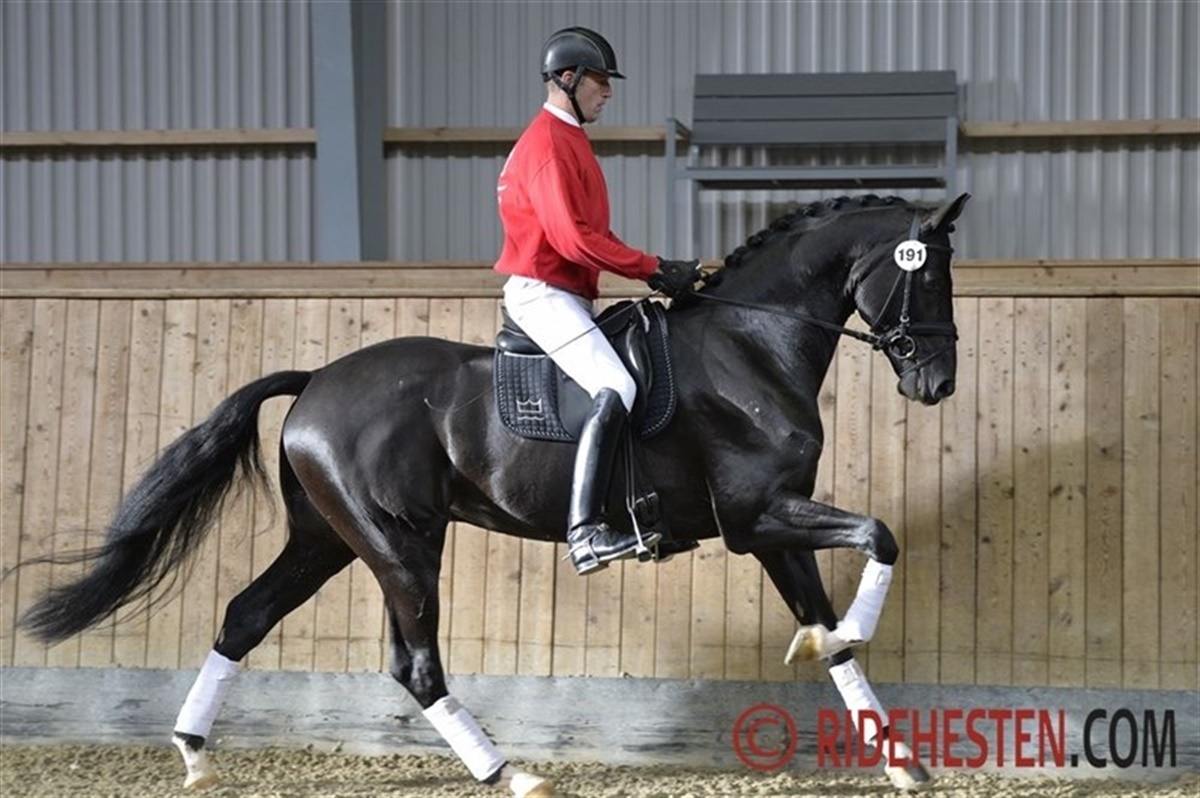 Også Goldfinger V.D.T. e. Jazz/ Ferro/ Calypso I fra Helgstrand Dressage bestod prøven med 836,5 points og de kan begge fremstilles til endelig kåring ved Dansk Varmblods hingstekåring til marts.